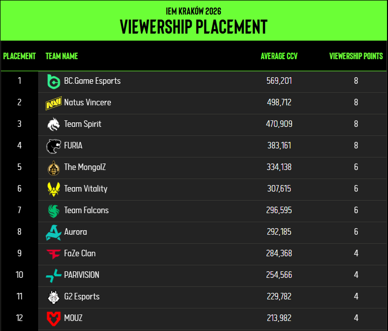 BC.Game以平均569,201的在线观看人数而高居榜首,NAVI、Spirit与FURIA分列第2-4位,前四队获得8点积分。