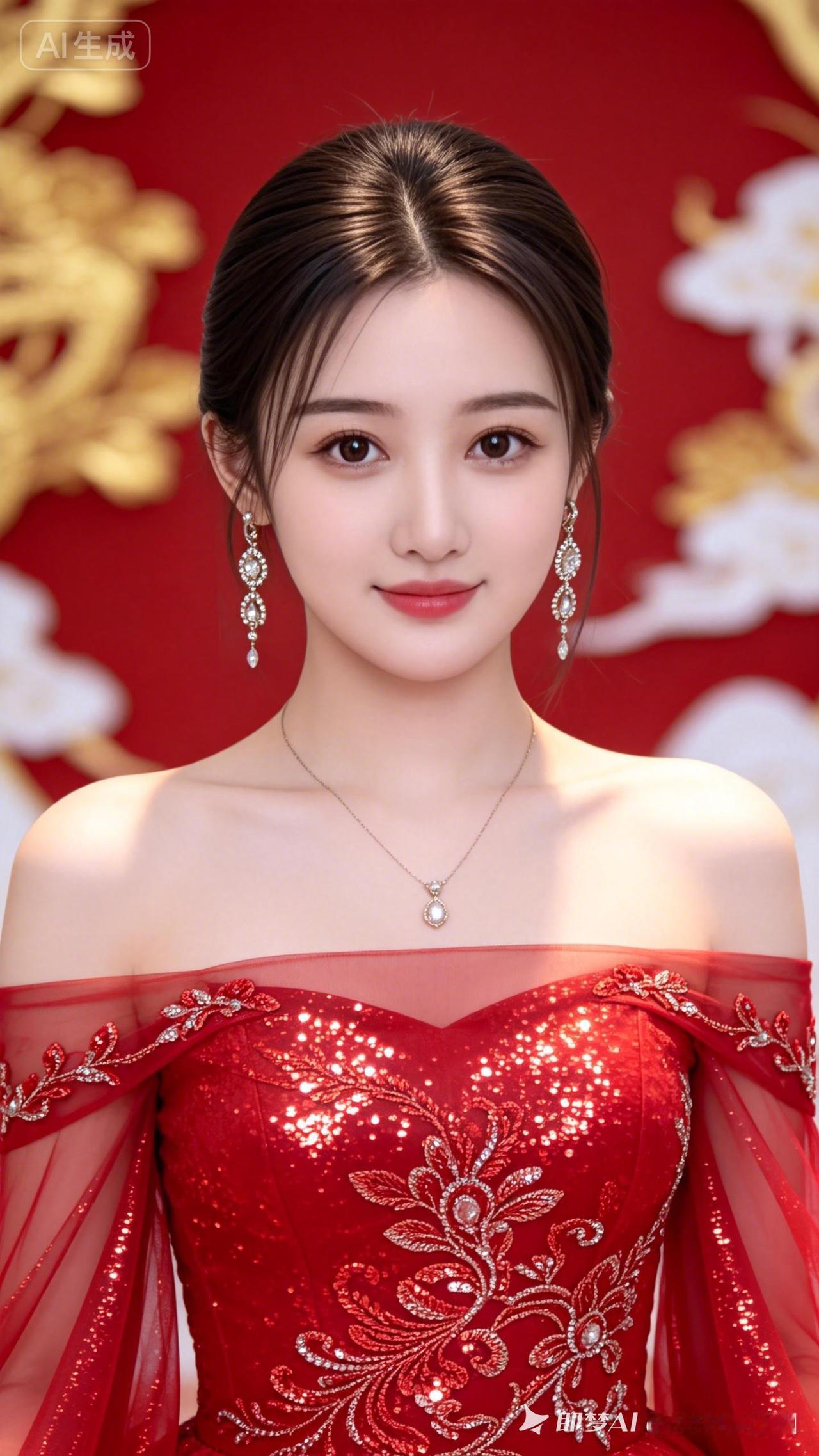 年轻美女浅笑嫣然,身着红金闪耀国风轻纱婚服,露肩设计尽显优雅。妆容精致,眉眼温柔幸福,佩戴华贵珠宝。柔光勾勒身姿,背景淡雅朦胧,红金主调浪漫庄重,细节绝美,尽显东方新娘典雅韵味。