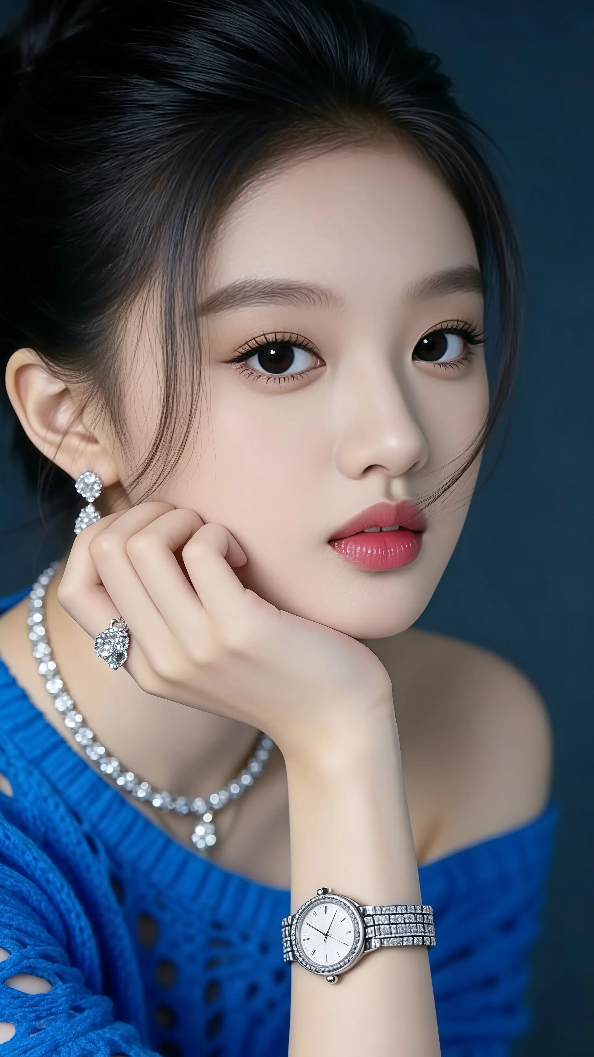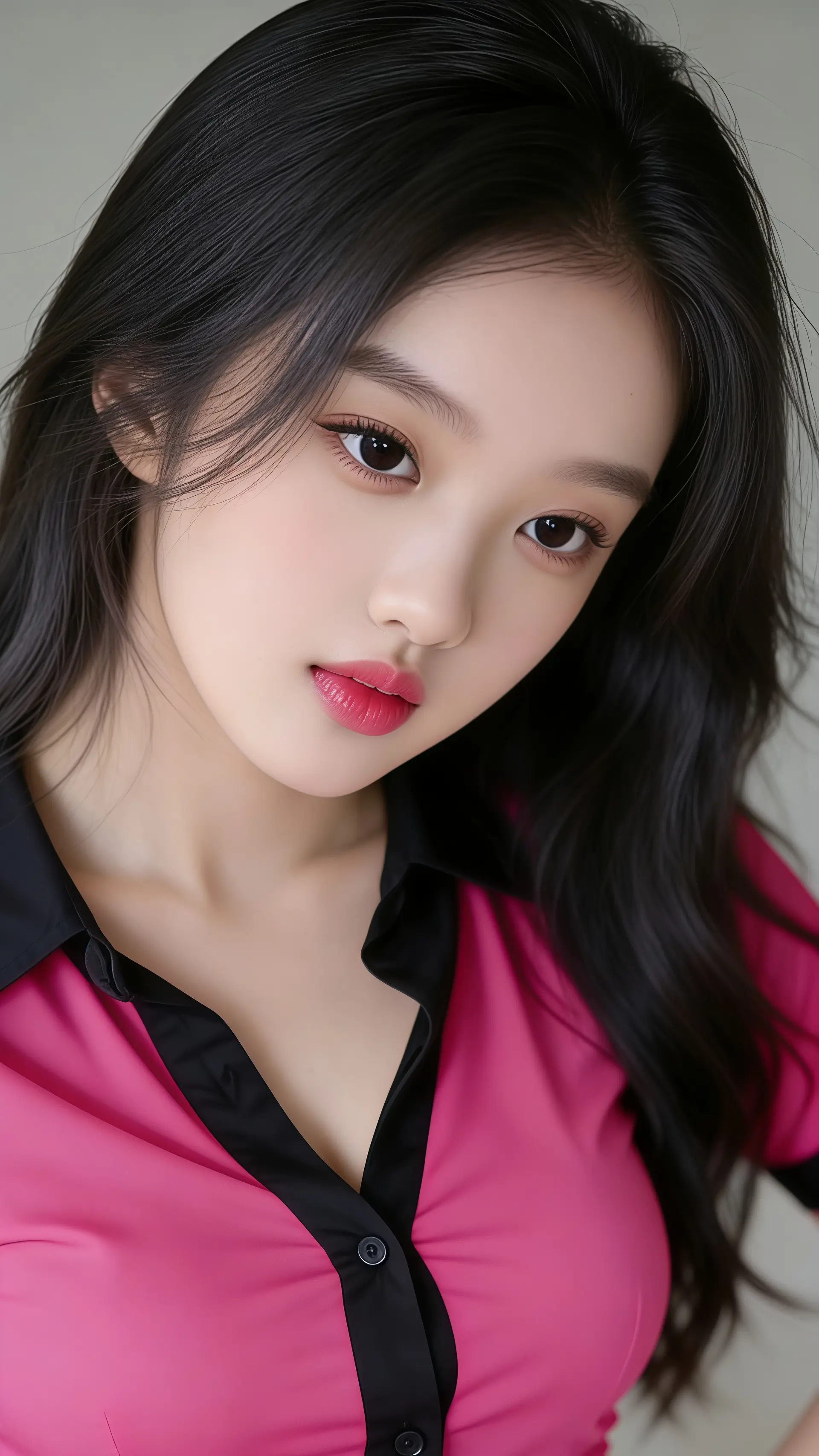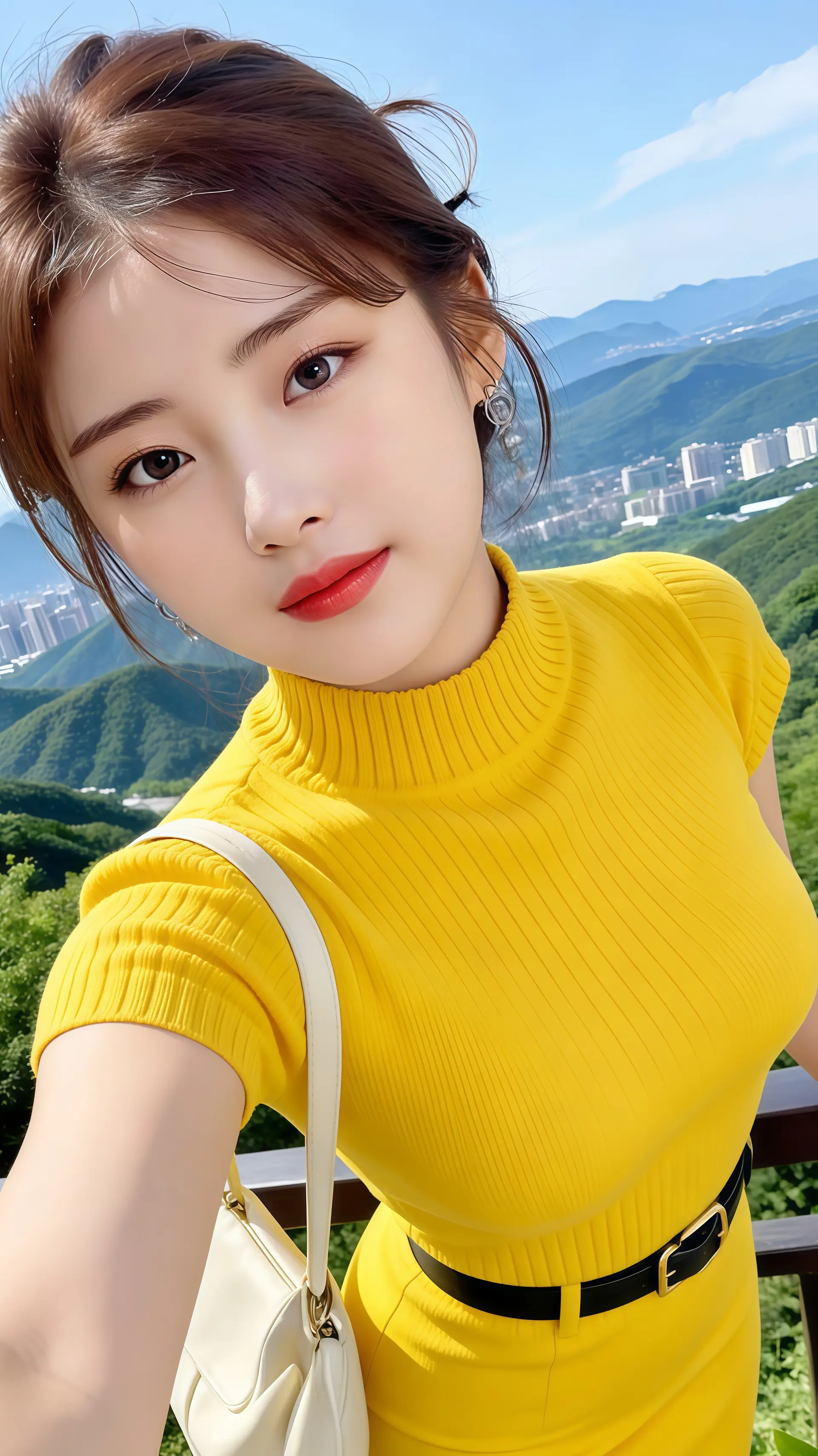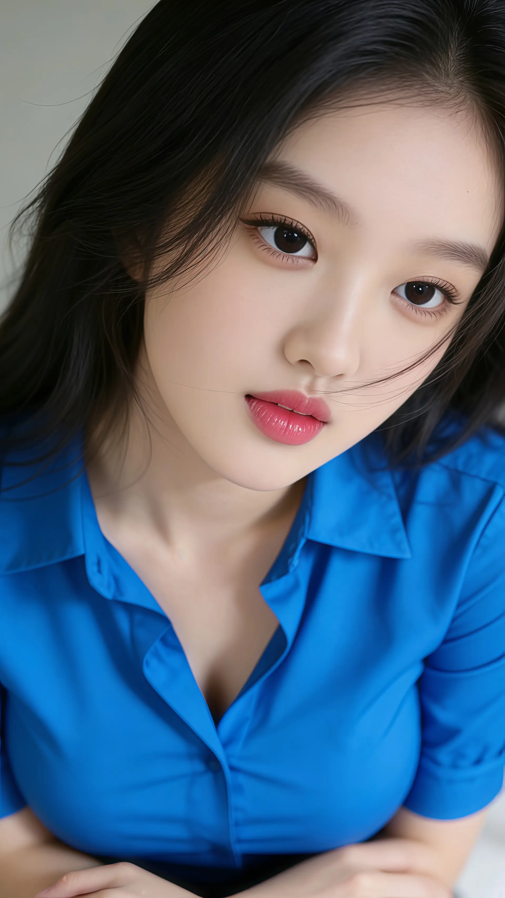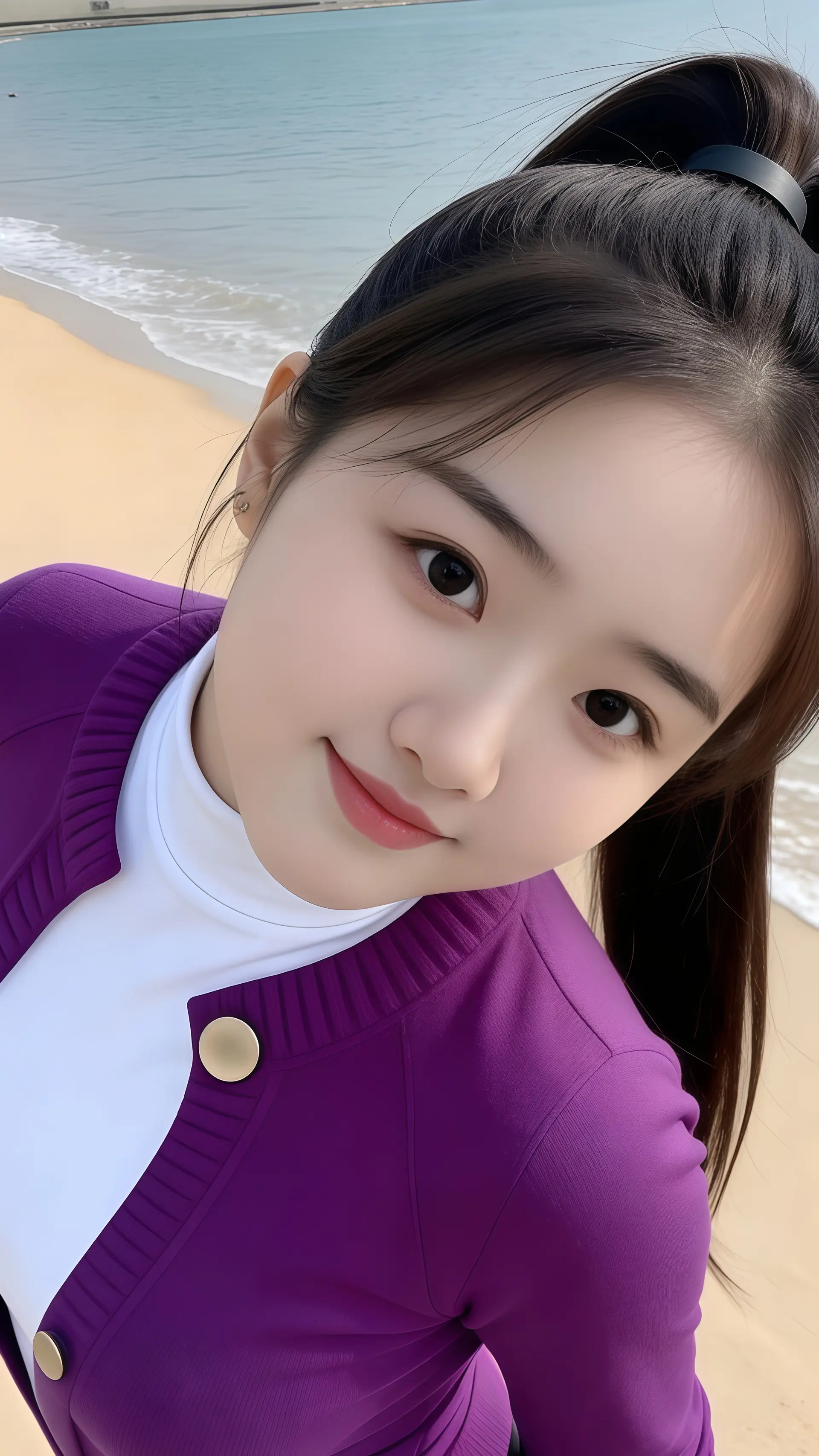 18岁女大学生,尖下巴,三庭五眼比例均衡,棕色简约盘发。身材娇小,细腻陶瓷水嫩肌
