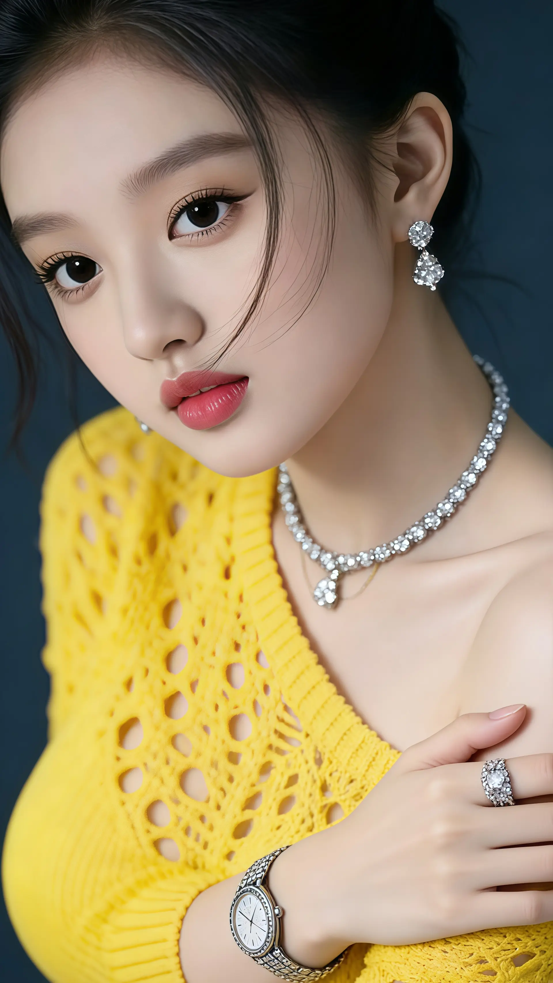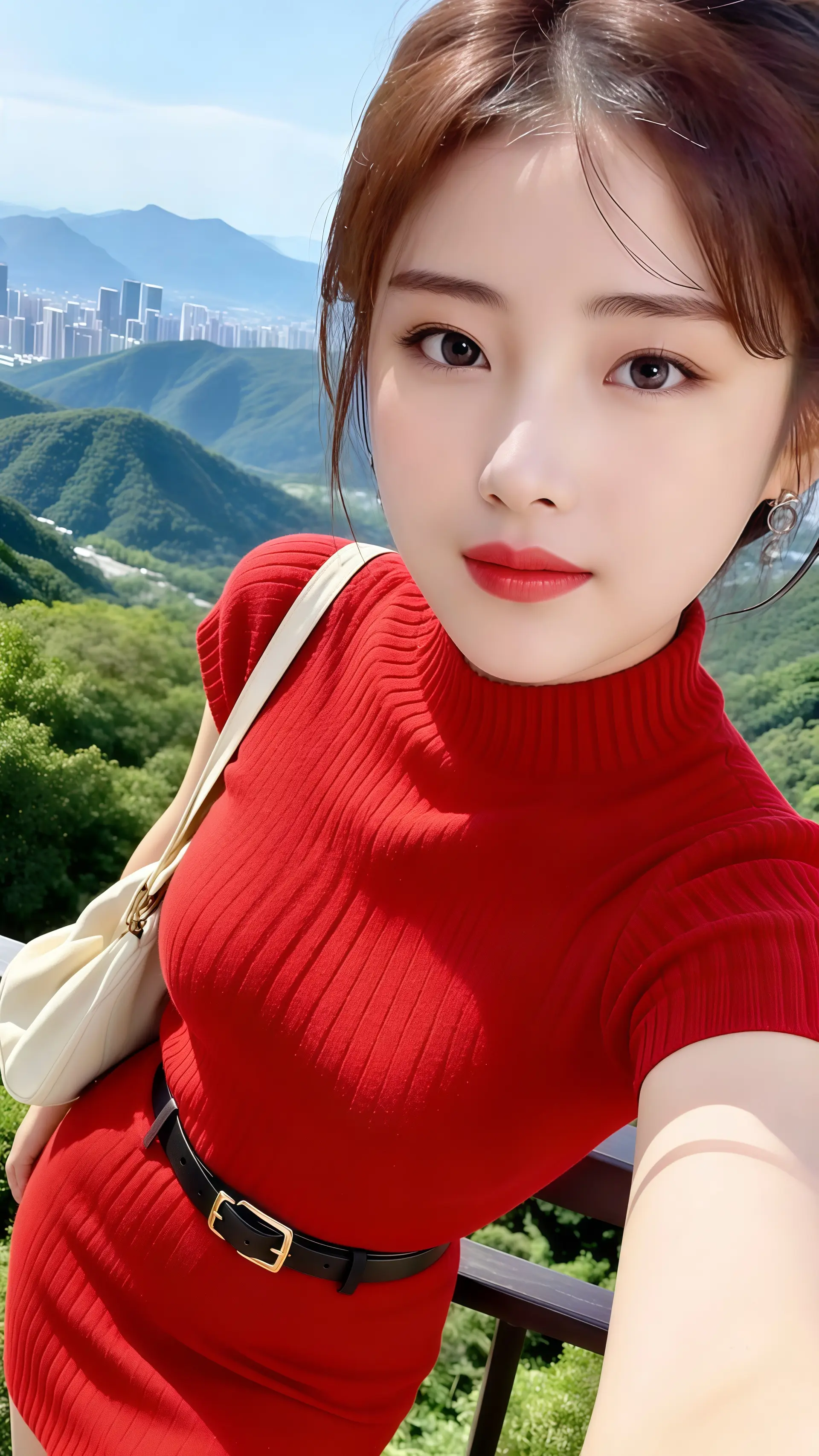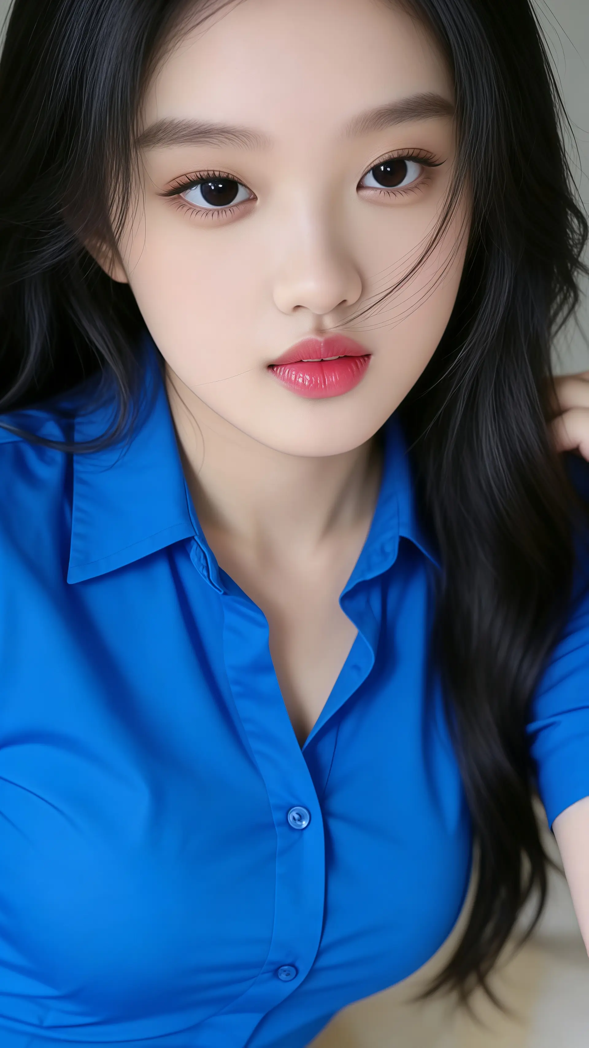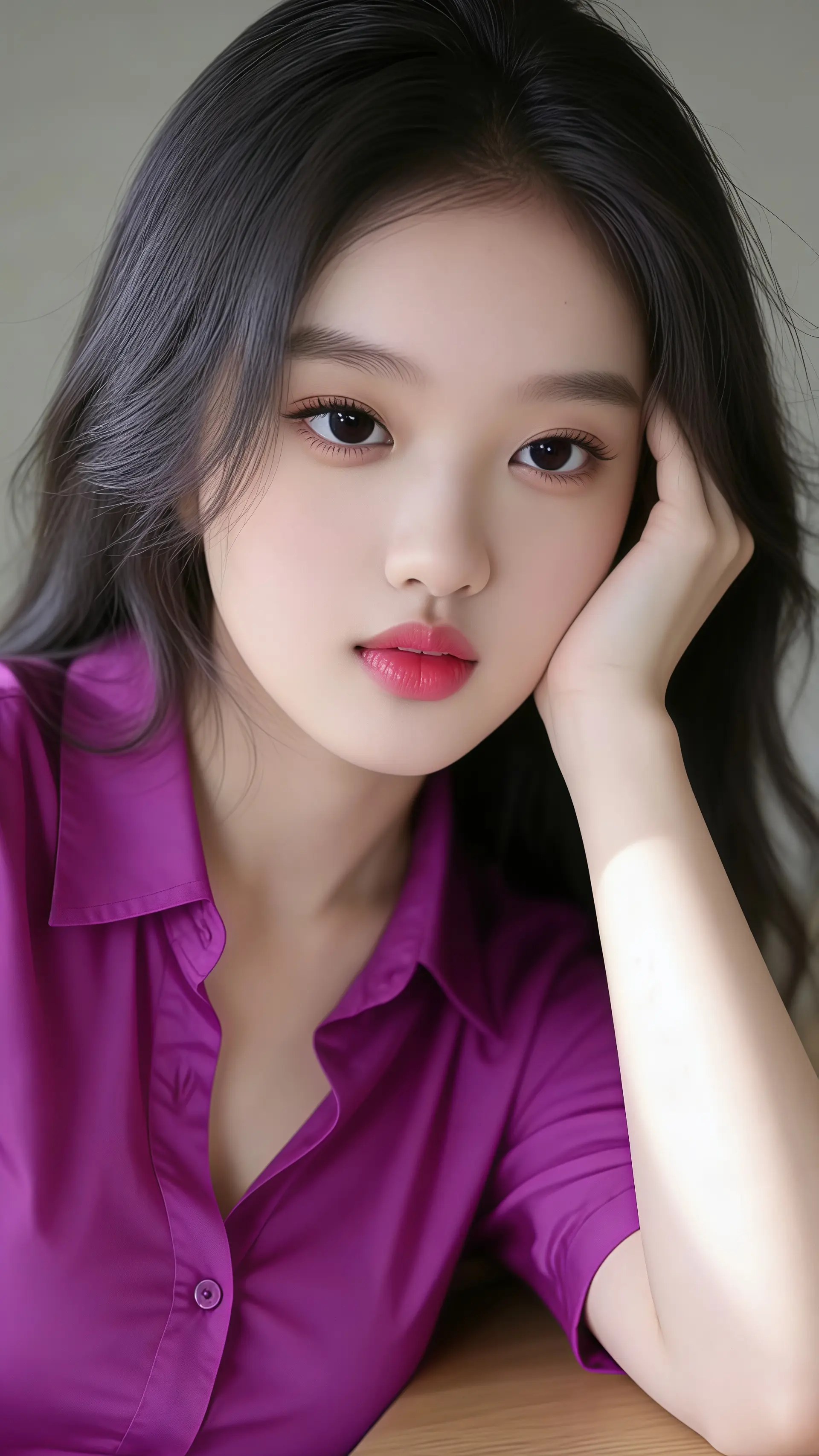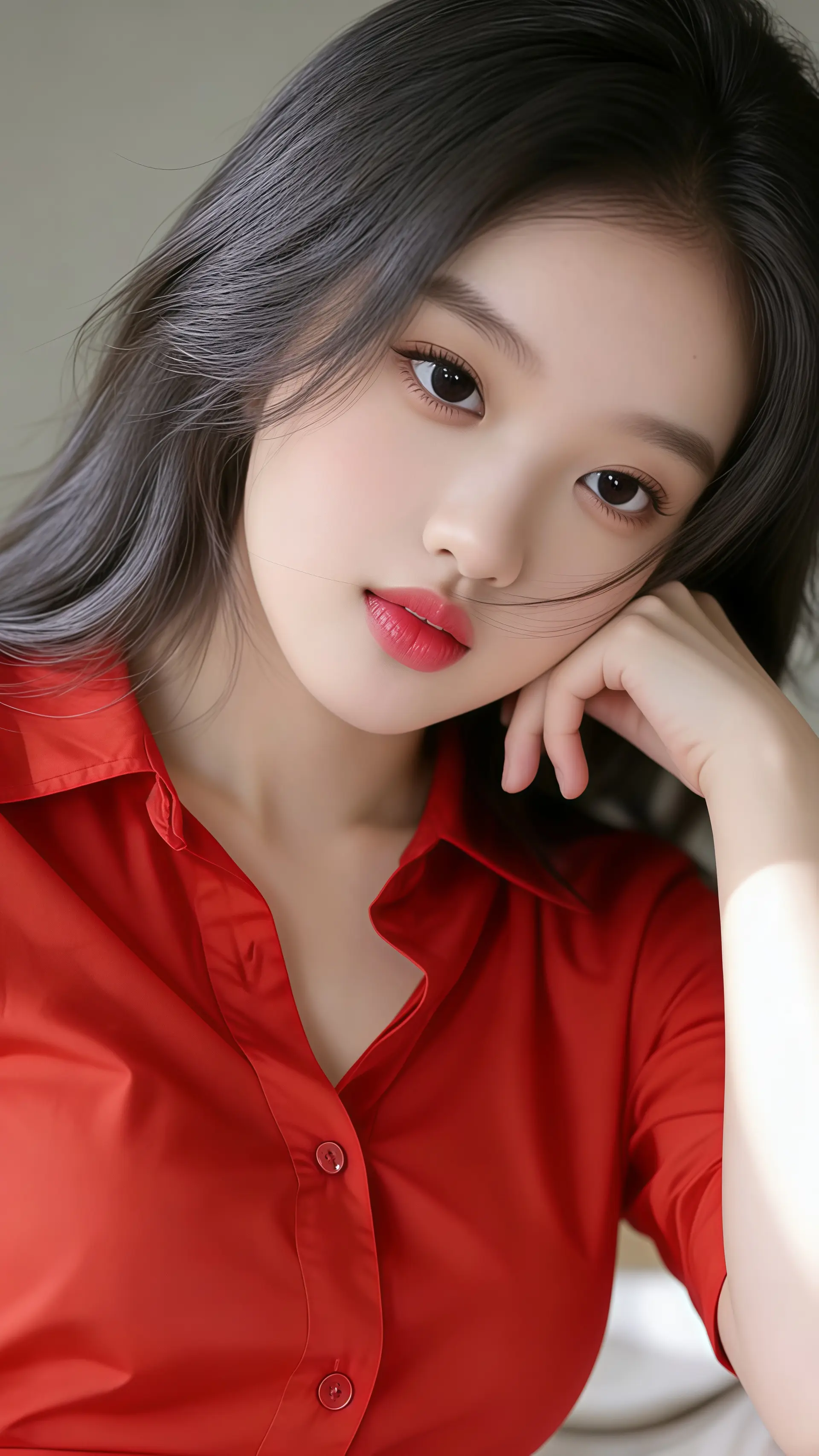 18岁女大学生,尖下巴,三庭五眼比例均衡,棕色简约盘发。身材娇小,细腻陶瓷水嫩肌