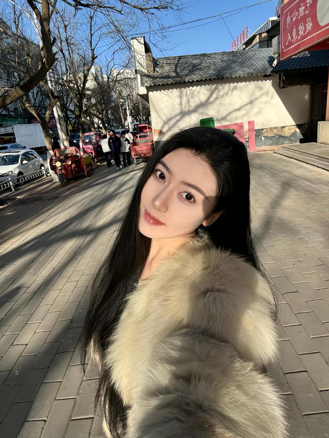 夜晚的街头,时尚穿搭,黑皮草外套搭配黑色短裤,优雅又帅气!