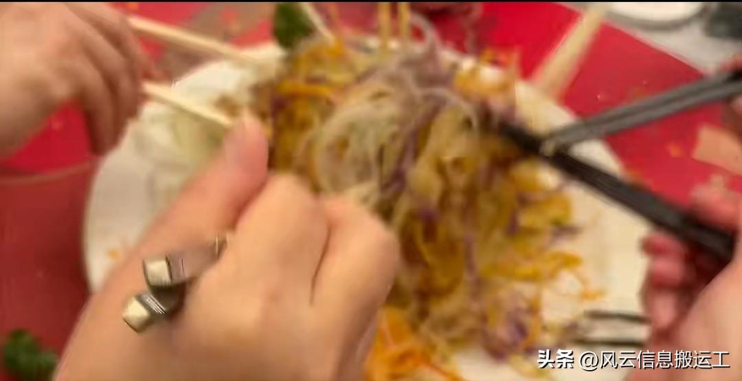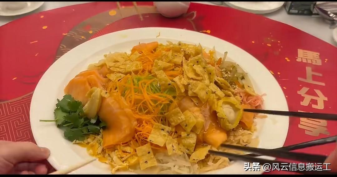 香港新春开年饭必备:捞起,又称“七彩捞起”,名字因当中七彩缤纷的食材组合而来。 传统形式是在一个大盘子中放置各种食材,包括生鱼片、蔬菜、五香粉、花生碎、鱼生酱等。 捞起的广东口语意思是将事业做起飞,而捞起动作从低往高,寓意无论个人运气、事业都逢低反弹,来年风生水起。 围桌者一起使用筷子将多种食材由低至高炒上捞起并抛向天空,同时在过程中大声说出吉祥的祝福语句,预祝大家来年的好运和财富。