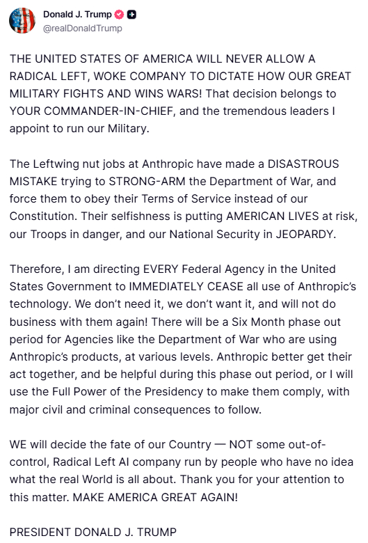 惨,最反华的美国AI公司Anthropic,被美国政府猛烈“制裁”了。美国时间2月27日,美国政府宣布将Anthropic列入“供应链风险”(supply chain risk)黑名单,这意味着任何与美国军方合作的公司(如波音、洛克希德·马丁这些军工巨头)如果敢用Anthropic的东西,就会丢掉政府生意,跟当初华为一个待遇了。阿川刚刚也发文猛批Anthropic为“左翼疯子”“觉醒公司”,下令所有联邦机构立即停止使用Anthropic技术(留6个月过渡期)。