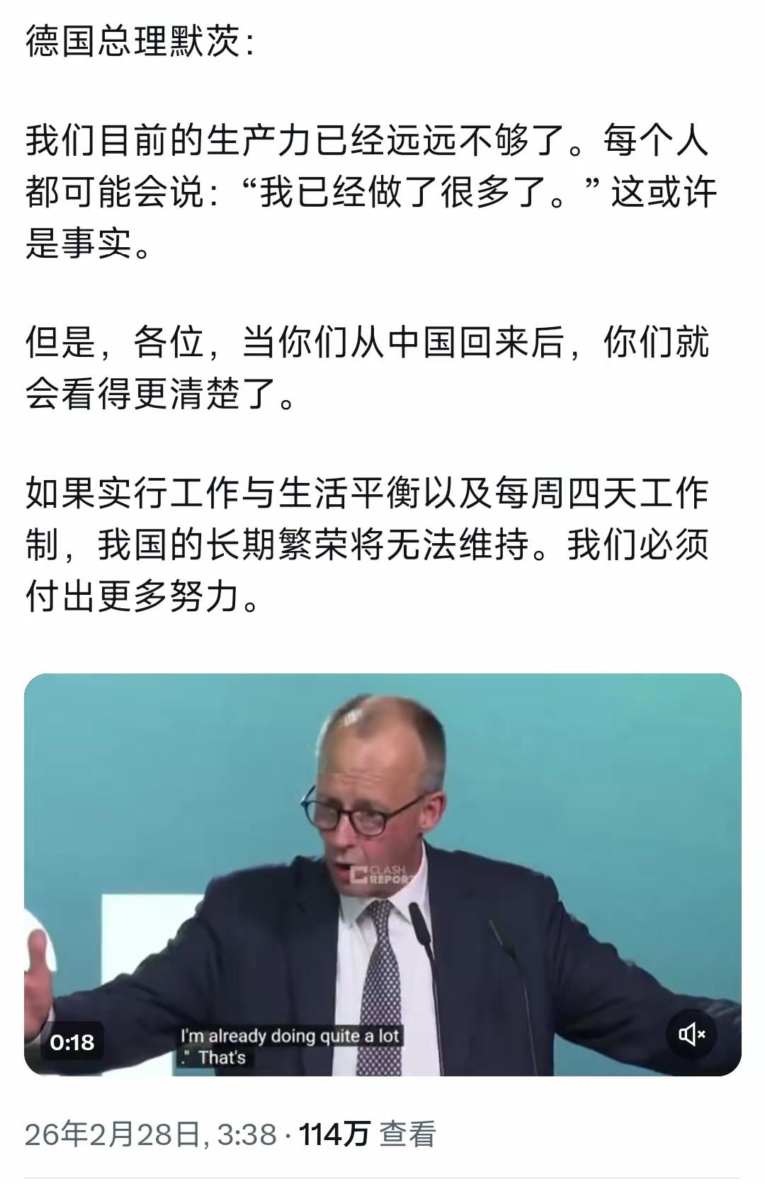 默茨这番话挺有意思。他说德国目前生产力不够,还拿中国作对比,意思是德国人得更拼。现在很多人倡导工作与生活平衡,还有四天工作制,可他觉得这会影响德国长期繁荣。 想想也是,在如今竞争激烈的全球市场,生产力就是竞争力。就好比企业间比拼,谁效率高、产出多,谁就能占据优势。德国作为制造业强国,要是生产力跟不上,未来发展可能真会受影响。 不过让大家付出更多努力,也得考虑员工承受力,不然可能适得其反。看来在工作和发展之间找平衡,还真是个难题。
