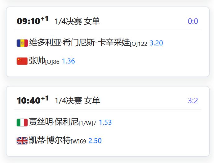 WTA500赛梅里达站,女单四分之一决赛,张帅将不早于北京时间今天上午9:10对阵同为资格赛球员的卡辛采娃; 女双半决赛,蒋欣圩/布克沙将对阵皮特尔/曾丽美; WTA250赛奥斯汀站,女单四分之一决赛,袁悦将对阵本土球员克鲁格; W35莫纳斯提尔,女单半决赛,施晗将对阵资格赛球员季哈奇科娃; 小将孙心然将对阵3号种子奥克佳布列娃。