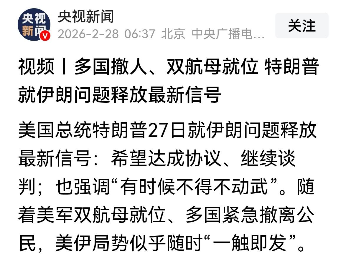 多个国家都在撤侨。美国的双航母已经到位。特朗普又放出了缓和的信号。我认为美国必须要打伊朗。虽然伊朗也放出来善意。但是以色列肯定不同意的。以色列必须要逼着美国去打伊朗。伊朗也不会放弃浓缩釉。伊朗一旦放弃浓缩油。伊朗就是以色列砧板上的肉。任凭以色列和美国的宰割。伊朗很明白这一点。因为伊朗知道就是因为他有浓缩釉。所以美国才不敢轻易动手。特朗普虽然放出风声要缓和,要谈判。但是特朗普的话,伊朗肯定也不会相信。因为伊朗的领导人也知道,特朗普是说一套做一套。特朗普虽然嘴巴说要谈判,但是暗地里有可能会对伊朗发起突然袭击。希望伊朗提高警惕。只要伊朗不放弃浓缩油。那就让以色列睡不着觉。所以,内塔尼亚胡要逼着美国总统特朗普去打伊朗。只要美国干掉伊朗,以色列就可以在中东继续称王称霸。