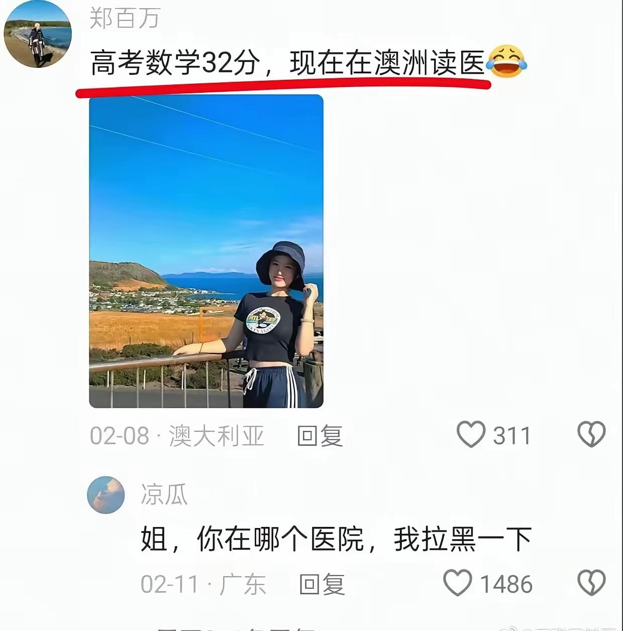 高考数学32分,出国留学到澳洲学医了。 以前是学霸才能出国留学,现在是留学的大部分是学渣? 千万别回国,国内的医院千万别收这样的医生,否则真是害人害己。 高考数学出了社会可能没啥用了,但是绝对能说明很多问题。
