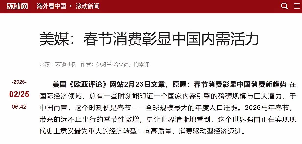 年味儿刚散,外媒的算盘珠子就拨得噼啪响,这就急了? 春节刚过完,马来西亚《星报》先跳出来甩数据:全国重点零售餐饮企业日均销售额同比暴涨10.6%。记者跑了好几个城市,发现今年老百姓请客全往饭店跑,家里灶台冷得能养鱼。餐饮老板手机响到发烫,包间早订光,大堂翻台翻到服务员腿软。 美媒《欧亚评论》盯着另一个数字挪不开眼:95亿人次。这是今年春运的流动总量,相当于把全球四分之一的人口搬了一次家。美媒酸溜溜地承认,这规模搁哪个国家都得跪,只有中国扛得住。文章里还藏着一句狠话,2026年春节,世界正围观中国消费史上最凶残的一次转型。 转型转成啥样?以前过年抢新车抢手机,全是往家里搬实物。今年风向突变,阿勒泰雪场排队两小时滑五分钟,哈尔滨冰雕前全是自拍杆,西安城墙灯会挤丢孩子都得用广播喊。老百姓花钱买的不是东西,是朋友圈九宫格和一家人的傻笑。 购物车也翻了个个儿。智利车厘子新西兰奶粉法国生蚝,全球尖货往购物车里扒拉。大牌照买不误,但渠道换了,奥莱和唯品会成了新战场。广州奥莱人挤人像在抢赈灾物资,杭州百联客流和销售额双双捅破天花板,扬州砂之船门口排队长到外卖小哥绕道走。唯品会上连衣裙销量涨了五成,女士T恤直接翻倍。消费者学精了,既要面子又要里子,大牌得穿但不能多花一分冤枉钱。 今年是春节申遗成功后的第二年,餐馆爆满商场排队景区挤成照片,热腾腾的烟火气从南烧到北。那边国外还在炸来炸去闹来闹去,这边老百姓拖家带口满世界溜达,外媒不眼红才怪。 我就想问问,今年春节你在哪儿挤的?年夜饭在饭店排了几个小时队?买东西有没有抢到骨折价?评论区聊聊,让我羡慕嫉妒恨一下。