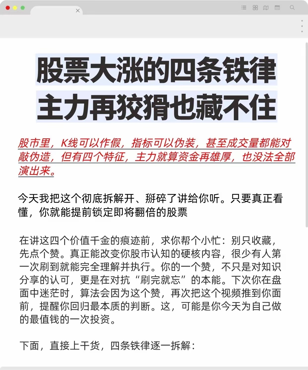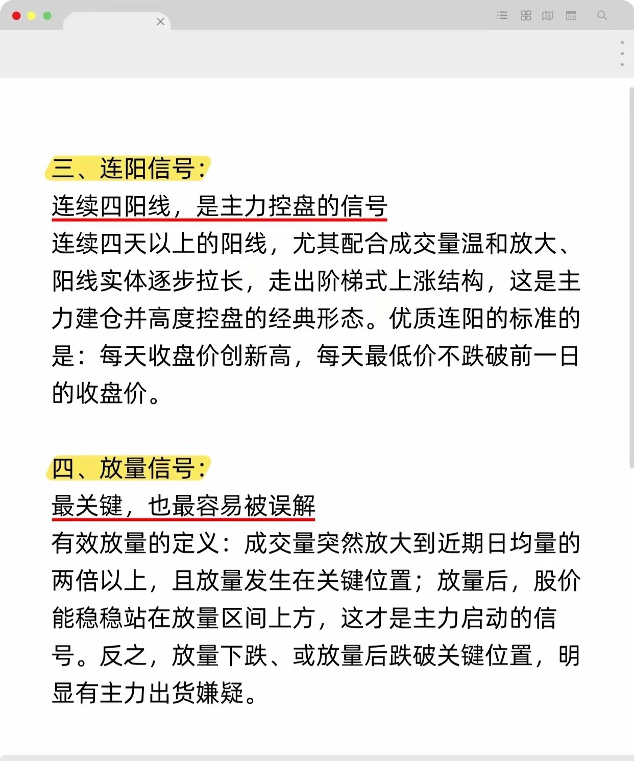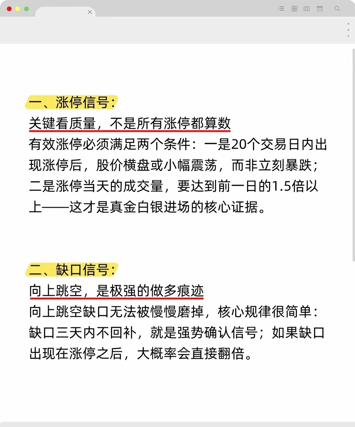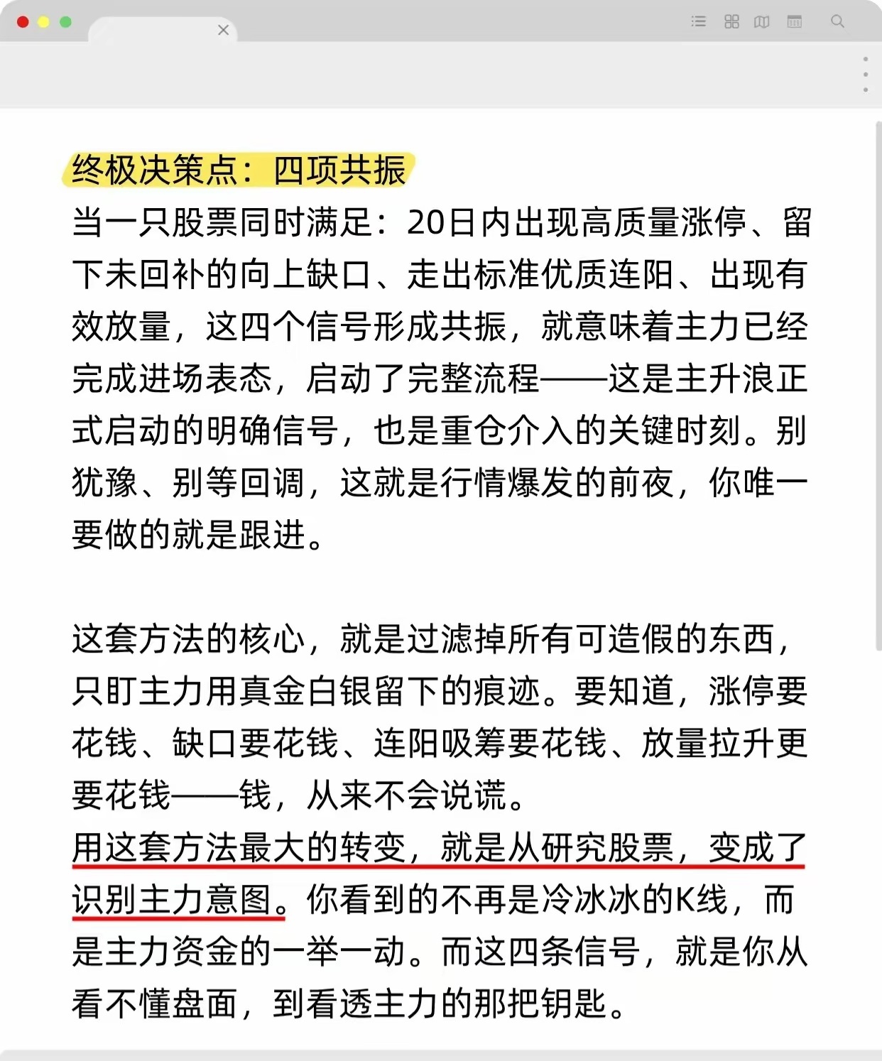 以下总结了股票大涨的四个关键信号及综合判断方法:1. 涨停信号:20日内涨停后横盘或小幅震荡,且当日成交量≥前日1.5倍。2. 缺口信号:向上跳空且三天内不回补,涨停后出现则翻倍概率大。3. 连阳信号:连续四天及以上阳线,收盘创新高、最低价不破前日收盘,量能温和放大。4. 放量信号:成交量突增至近期日均量两倍以上,出现在关键位且股价站稳放量区。终极策略:四项信号共振时,主力已进场,主升浪启动,为重仓买入时机。核心是追踪主力真金白银痕迹,而非单纯看K线。