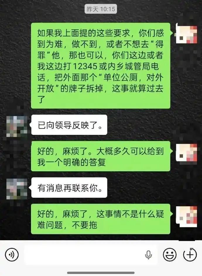 这下事情闹大了!河南内乡县,男子突发内急,刚好看到政府机关的厕所对外开放,就走了进去,经过门卫时就问了保安一嘴,结果得到的不是回答,而是辱骂,事后男子越想越气,直接把这个事曝光到网上。当地回应:情况属实,公开道歉 当天,王先生外出买菜,抬头看到路边有个院子,门口挂着醒目的牌子:单位公厕,对外开放。牌子指向的是内乡县农业农村局 王先生也没多想,顺着指示就进去了。政府的门敞开让老百姓上厕所,这本来是件好事,便民嘛。可接下来的事儿,让他怎么也没想到 王先生进了大院,主楼就在眼前,但厕所在哪一层、哪个方向,他不太确定。这时候,值班室里走出来一个工作人员。王先生就顺嘴问了一句:师傅,麻烦问一下,厕所在哪儿? 就这一句话,捅了马蜂窝 对方眼皮子都没抬,直接甩过来一句:你眼睛瞎了吗?不会自己看指示牌? 王先生愣住了。他后来解释说,自己高度近视,当天正好没戴眼镜,看东西确实费劲。但这解释已经没用了,话已经砸在脸上 他心里不舒服,但没当场发作,毕竟人有三急,先解决事儿要紧。等他从厕所出来,想着跟对方好好说说——都是普通人,没必要说话这么冲吧? 结果,对方根本不接茬。王先生往大门口走的时候,对方甚至把院子的电动推拉门给关上了,意思很明显:赶紧走人 王先生这时候也有点压不住火了,掏出手机开始录像。一看他录像,门又开了。对方嘴里还在念叨:你还想让我把你当神敬啊?你今天是不是闲得没事干了? 回到家后,王先生越想越气,直接打电话举报,得知对方并非临时工,要求正式道歉。官方通报:基本属实,涉事人员系下属企业职工,责成其公开道歉并做出处理 有网友说:门卫有门卫的职责,任何人都能进,那要门卫有啥意义? 这话用在这个事上,其实是不对的,门卫的职责,是看门护院,不是看人下菜碟。他的活儿是守着这扇门,别让坏人进去搞破坏,别让车乱停乱放,不是站在门口当判官,看谁顺眼让谁进,看谁不顺眼骂两句 王先生是看到“单位公厕对外开放”的牌子才进去的。这牌子是谁挂的?是农业农村局自己挂的。既然挂了牌子,就意味着单位已经考虑过这个问题,老百姓可以进来上厕所。这不是王先生翻墙进来的,也不是他硬闯的,是人家按规矩办事 这就好比你店门口挂着“欢迎光临”,人家进来了,你张嘴就骂,这道理讲不通 而门卫的职责,恰恰他应该在那看着,引导进来的人该去哪儿,不该去哪儿。厕所在一楼,你指一下;想往楼上办公区跑,你拦住。这叫履行职责