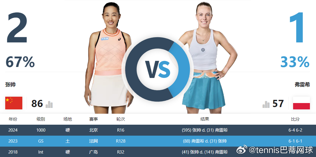 进入WTA梅里达四强后,张帅世界排名来到62位;她将在半决赛对阵波兰名将弗雷希,双方交手纪录是张帅2:1领先,而且最近一次交锋也是横扫获胜;