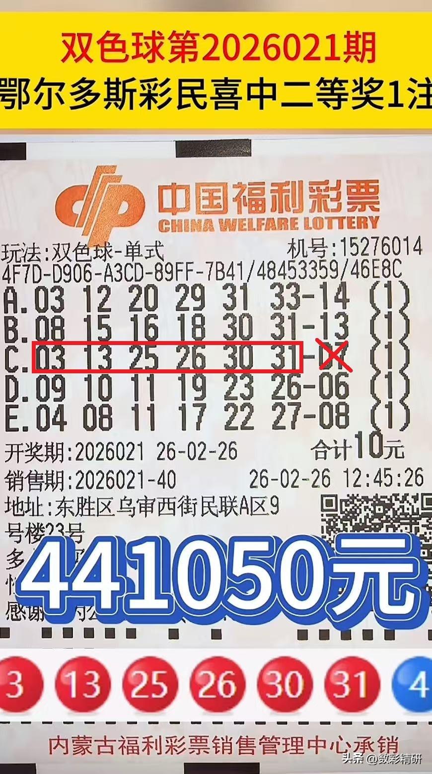 仅因一数之差,与707万头奖擦肩而过!在上期双色球第26021期开奖中,全国共开出二等奖113注,单注奖金达44万余元。其中,来自内蒙古鄂尔多斯的一位彩民,凭借一张单式5注彩票,第三注命中6个红球,仅因蓝球与04失之交臂,憾失头奖。一号之差,奖金便从707万元骤降至44万元,令人惋惜。 所幸,在新规施行后,双色球二等奖奖金已大幅提升。若是以前,同样开出113注二等奖,单注奖金往往仅十余万元。因此,虽与大奖失之交臂,但能收获这份几倍的幸运,亦不失为一份安慰。