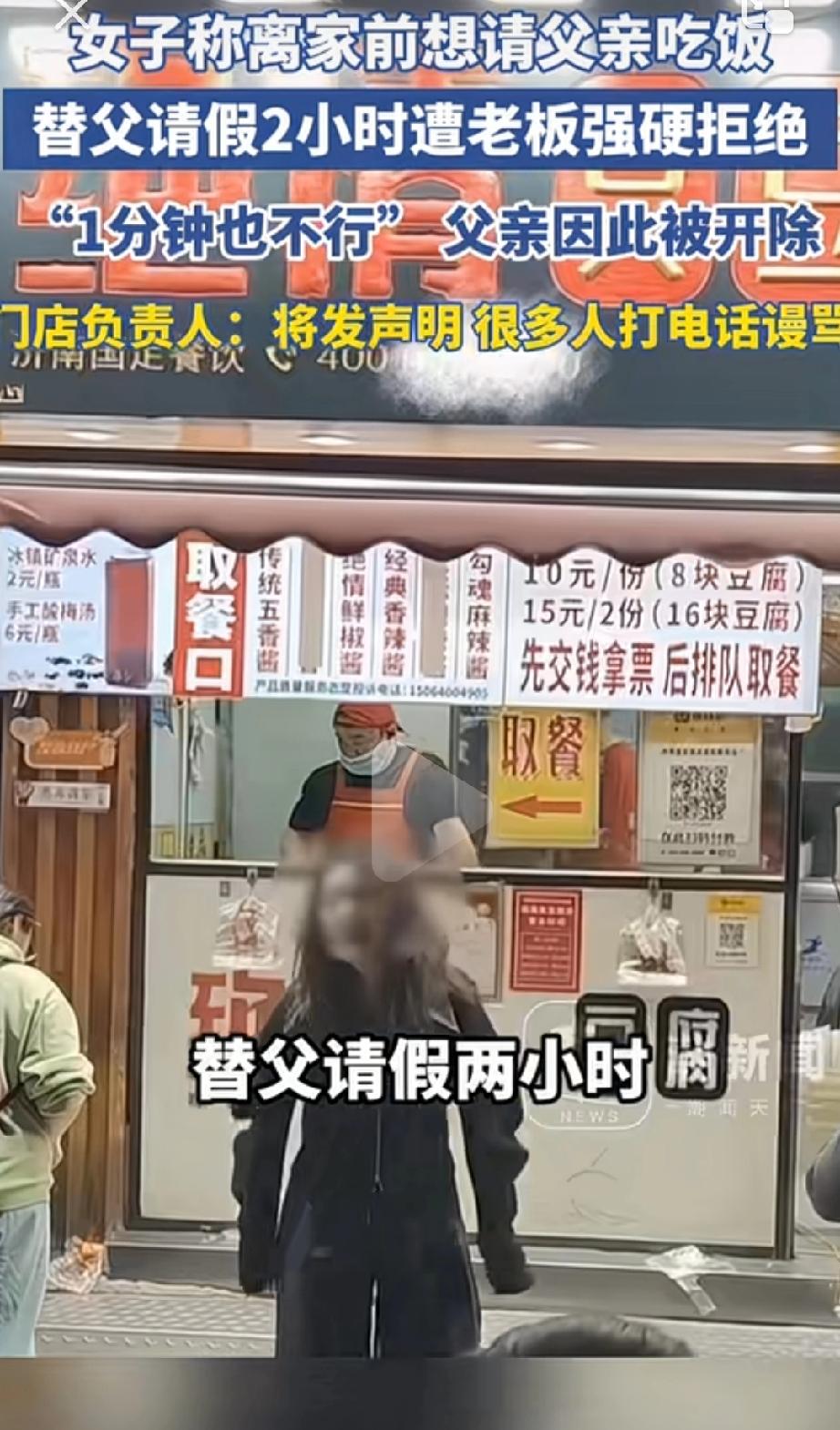 太绝情了!山东济南,李女士,初六要回外地上班,想在离家前和父亲吃顿饭,就替在臭豆腐店打工的父亲请2小时假,还愿意自己承担扣工资的损失,哪成想老板直接强硬拒绝“说1分钟都不行!” 李女士的父亲是济南这家“绝情臭豆腐”店的炸锅师傅,今年春节只休息了一天,平时天天从早忙到晚,经常干到凌晨才下班,工作特别勤恳,家里有事都很少请假,是店里的老员工。 李女士正月初六就要回杭州上班,整个春节就和父亲吃了一顿饭,心里特别不舍,就想在初五晚上和父亲吃顿团圆饭送送行。 她特意选了晚上11点后门店客流量少的时间段,给老板打电话替父亲请2小时假,还反复说愿意自己掏钱承担请假扣除的工资,保证不会耽误门店生意。 可不管李女士怎么说,老板的态度都特别强硬,就一句话:“一分钟都不行!”挂了电话后,老板还立马给李女士的父亲打电话,直接威胁要辞退他,没过多久,真的把老人开除了,还把他踢出了工作群。 李女士又气又心疼,跑到门店门口控诉老板的绝情。之后老板想和李女士协商赔偿,却只愿意给1个月工资,李女士不接受,已经委托律师维权! 而门店面对记者的询问,要么说“关你什么事”,要么说李女士发布的是不实信息,却又说不出哪里不实,还反过来喊冤,说自己被网友谩骂。 有网友说:“绝情臭豆腐果然名不虚传,做人也太绝了!不过是2小时,还是深夜客流少的时候,又不是无故旷工,连一顿团圆饭的时间都不给,心是石头做的吗?” 还有很多打工人感同身受,留言说:“太能体会这种感受了,我们打工的就不配拥有一点亲情吗?勤勤恳恳干活,到头来连这点小小的心愿都要被掐灭,还随便被开除,这也太欺负人了!” 也有网友怼门店的喊冤:“还好意思说被谩骂,先想想自己做的事有多寒心!人家父亲干了这么久,没功劳也有苦劳,说开就开,换谁看了不生气?这都是自找的!” 真的太心疼这位父亲了,为了家庭起早贪黑干活,熬到深夜,就想和女儿吃顿简单的离家饭,这点小小的愿望都被无情拒绝,最后还丢了工作。 打工人挣点钱不容易,凭什么连最基本的尊重和人情都得不到?换任何一个人,遇到这样的事,都会觉得委屈又气愤! 职场要讲规则,这一点没人反对,可规则从来都不是冷冰冰的条条框框,更不能成为老板漠视他人情感、随意拿捏打工人的借口。 一顿离家前的团圆饭,藏着最普通也最珍贵的亲情,这位老板拒绝的不只是一次2小时的请假,更是凉了无数打工人的心。 现在当地官方已经介入调查,希望能尽快查清楚事情的真相,给这位勤恳的老父亲一个公道,让他的合法权益得到保护。 开店做生意,说到底做的是人心,善待员工才是根本。员工是支撑起店铺的基石,多一份理解,多一份包容,多一点人情味儿,才能走得更远。 别让冰冷的规则,磨掉了人与人之间最基本的温暖,毕竟,人心换人心,才是最长久的道理。