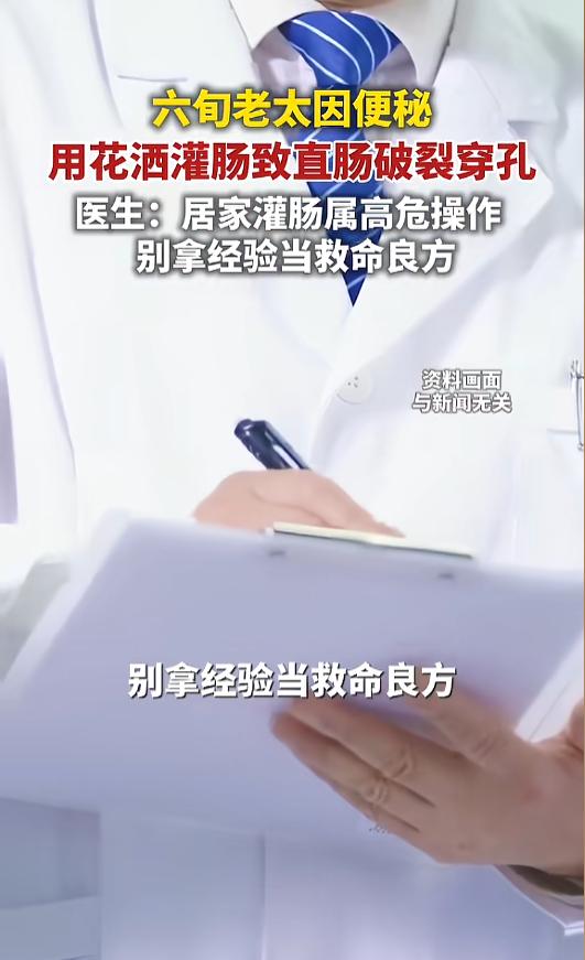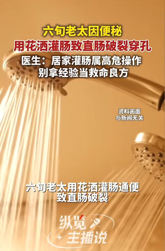 “悲剧还是发生了!”近日,湖南长沙,一老太因直肠破裂穿孔被紧急送往医院,罪魁祸首竟然是花洒?原来,老太患有便秘,最近情况加重了,便私自用花洒进行灌肠,没想到,操作失误把自己送进了医院。网友:胆子这么大的么? 现代人工作时动不动久坐久站,饮食也高油高盐的,很容易就被便秘找了上来。总有些人“灵光一闪,想自己通一通”,却酿成了恶果。 据媒体2月27日报道,老太今年65岁了,已经患有便秘多年了。过年期间,因为饮食油腻,便秘又加重了,腹胀难忍之下,老太动了“灌肠”的心思。 原来,老太此前已经多次使用花洒软管,私自给自己进行灌肠通便操作,之前一直没出过什么意外。 这一次,老太和往常一样,又故技重施了起来,没想到意外发生了。老太在操作时,不慎用力过猛,软管重重插了进去,直肠当场就发生了破裂。老太疼痛难忍,连夜去往了医院。 检查中发现,老太的腹腔已经被粪便污染,情况十分危急。医生当即安排了手术,经过紧张的手术治疗,老太最终脱离了生命危险。 医生提醒,居家灌肠危险多,别拿经验当良方。老年人的肠道十分脆弱,私自灌肠极易造成肠穿孔,引发严重感染,危及生命! 便秘患者首先应当考虑调整自身的饮食结构,通过食疗进行缓解。若是症状没有减轻,或是需要用药物或其他方式治疗,应当前往正规医疗机构,在专业医生的指导下用药!灌肠等危险治疗方式,更需专业人士进行操作! 信息来源:《六旬老太用花洒灌肠通便致直肠破裂。》纵览新闻