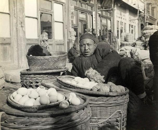 1937年,北平街头,一位小贩着厚实的棉袄在街边摆摊售卖食品,他头戴瓜皮帽,正倚靠在自己的货担上,他的眼神直视镜头,表情略显疲惫又带着一丝警惕,他面前的竹编大筐和木盘里,摆放着两种主要商品,大量的蛋类,个头饱满,整齐码放,旁边还有一些面食,像是窝窝头或其他粗粮主食。