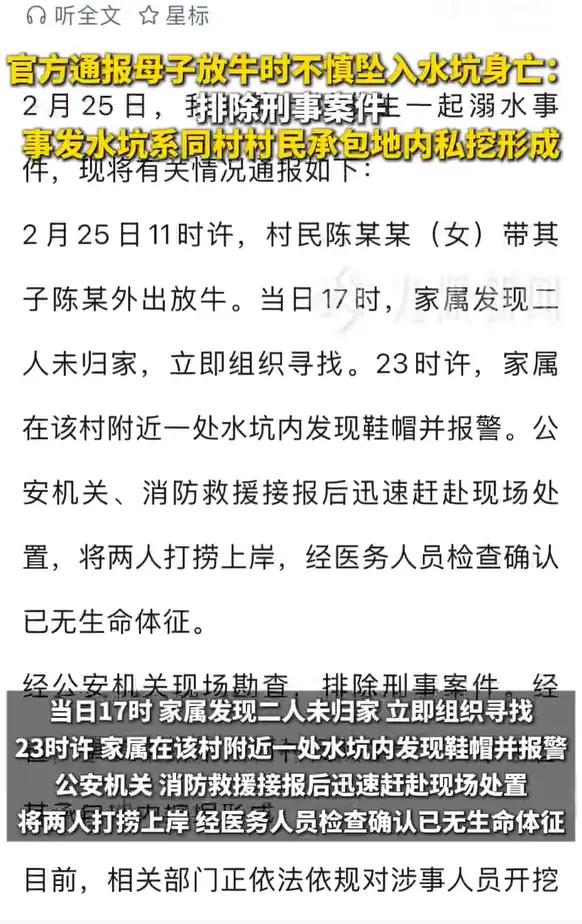 海南两母子放牛溺亡:平地变深渊,谁在“吃人”?两条人命换不来一个警示牌? 2 月 25 日,海南乐东县赖元村的天空格外阴沉,仿佛预示着一场无法挽回的悲剧。这一天,本该是寻常的农耕日子,却成了村民陈某某一家永远的黑夜。上午 11 点,陈某某像往常一样,牵着牛、带着儿子走出家门,去往村外的荒地放牧。谁能想到,这趟再普通不过的出门,竟是一场有去无回的诀别。 直到傍晚 5 点多,天色渐暗,家中仍不见母子二人的身影。起初家人以为只是贪玩或迷路,但随着时间一分一秒流逝,那种不祥的预感像野草般在心头疯长。焦急的呼喊声打破了村庄的宁静,村民们自发组织起来,手持火把和手电筒,沿着熟悉的放牛路线疯狂搜寻。夜色浓重,寒风刺骨,每个人的心里都悬着一块大石。 当时针指向深夜 11 点,搜救队伍在村附近一处偏僻的水坑边停了下来。借着微弱的光亮,人们发现了令人心碎的一幕:岸边散落着鞋帽,那是母子俩生前最后的痕迹。而在那漆黑深邃的水坑中,两条鲜活的生命已悄然消逝。当消防和公安人员费力将两人打捞上岸时,一切都已经太晚了。母亲紧紧护着孩子的姿态,成为了这个世界留给她们最后的定格。 警方迅速介入,经过细致的现场勘查和法医鉴定,最终排除了刑事案件的可能。这意味着,这不是一场人为的谋杀,而是一起令人窒息的意外。然而,正是这个“意外”二字,让人更加脊背发凉,怒火中烧。因为夺走这两条人命的,不是天灾,而是赤裸裸的人祸! 那个吞噬生命的水坑,究竟从何而来?调查结果显示,这是一个仅仅存在了一个多月的“新伤”。同村村民陈某,为了自家承包地的用途,在 2 月中旬擅自挖掘取土。短短几天,原本平坦的土地被挖出了一个数米深的大坑。春雨过后,坑内积水成潭,瞬间变成了一个隐蔽的死亡陷阱。 最令人绝望的是,这个深不见底的水坑,就像一只张开的血盆大口,静静地潜伏在村民必经之路旁。它没有哪怕一块“水深危险”的警示牌,没有一圈最简单的防护围挡,没有任何提醒路人注意的标识。它就那样敞着口,毫无防备地暴露在光天化日之下,等待着下一个不幸的过客。 我们可以试着还原那悲惨的一瞬间:或许是牛渴了想要靠近水边,或许是孩子出于好奇想要探头张望,又或许是母亲本能地伸手去拉拽。在湿滑的坑壁和浑浊的深水面前,人类的反应显得如此无力。一步踏空,便是阴阳两隔。两条人命,就这样轻飘飘地填进了一个无人管理的土坑里。 这件事让人心里堵得慌,更让人愤怒难平。在农村,挖坑取土、修渠建池本是常事,但“挖完不管”的陋习何时才能休矣?许多村民认为,地是我承包的,我想怎么挖就怎么挖,却忘了土地之上还有公共安全,忘了邻里乡亲的生命安全。坑挖好了,人走了,留下一地隐患。一旦下雨积水,这些坑就成了天然的“捕兽夹”,大人尚且难以察觉,何况是懵懂的孩子和年迈的老人? 现在,摆在我们面前最直接、最尖锐的问题必须得到回答:这个坑是谁允许挖的?有没有经过任何部门的报备审批?挖坑者陈某,作为直接责任人,明知深挖会形成隐患却不做任何防护措施,是否构成了过失致人死亡?当地的村委会和镇政府,在日常巡查中是否存在严重的失察?难道非要等到出了人命,才想起来要去立个牌子、围个栏杆吗? 两条鲜活的生命,两个破碎的家庭,不能就这样无声无息地消失在舆论的角落里。如果仅仅是赔钱了事,如果不能追究相关责任人的法律责任,如果不能唤醒基层管理者对安全隐患的敬畏之心,那么明天、后天,还会有第三个、第四个“赖元村水坑”出现。 安全无小事,生命大于天。每一个看似不起眼的疏忽,背后都可能藏着血的代价。我们呼吁有关部门尽快彻查此事,给逝者一个公道,给生者一个交代。更要借此案例,在全国范围内开展农村安全隐患大排查,让那些敞口的“吃人坑”统统加上围栏、竖起警示。别让今天的悲剧,成为明天重复的故事;别让无辜的生命,再为冷漠和疏忽买单!母子二人落水 九岁男童溺亡