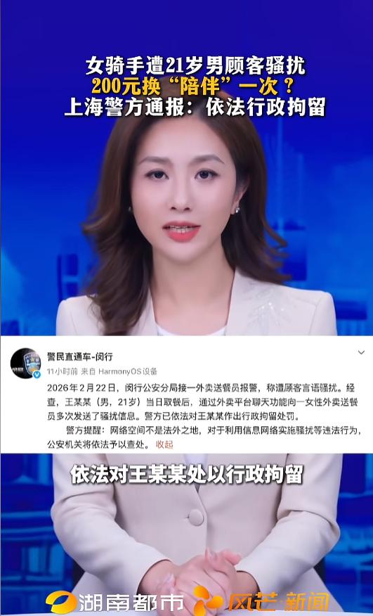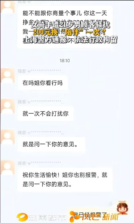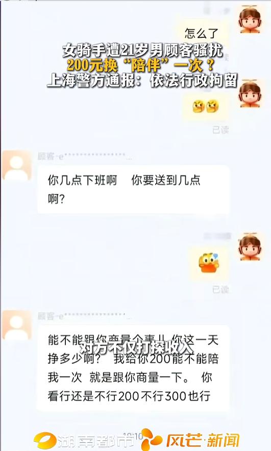 “实在是太嚣张了!”近日,上海,一女性骑手在送完外卖后,却被男顾客语言骚扰。对方通过外卖平台聊天系统给她发了多条信息,里面竟扬言让自己200元陪他一次。骑手气愤之余,立刻报了警,男顾客已被依法刑拘。网友:这下老实了吧! 劳动报酬有高有低,人格尊严却无分贵贱,欺侮他人,终将受到法律的制裁。 据媒体2月27日报道,00后女生小葛,是一位外卖女骑手。事发当日,她刚爬完五楼送外卖,订单交付后,却收到了男顾客的私信。 对方通过外卖平台自带的聊天系统,给她发了一连串的信息轰炸。刚开始还只是问她什么时候下班,后面竟然语言骚扰起来。 “你这一天挣多少啊?我给你200你能不能陪我一次?”“你看行还是不行200不行300也行”看到这些信息,小葛气不打一处来,当即报了警。 对方竟还恬不知耻,在里面一个劲的发着,“就一次不会打扰你,就是问一下你的意见,祝你生活愉快”。小葛果断回复,“我已经报警了!” 没多久,男子便被警方带走。在警察面前,男子一下子慌了,他辩解自己就是一下子脑热,给女骑手道了歉并赔偿了300元。最终,男子被警方依法行政拘留! 网友看后表示,罚的好,看他以后还敢不敢了!网络空间不是法外之地,利用网络实施骚扰,或进行其他违法犯罪活动,迎接他的,只能是法律的严惩! 信息来源:《女骑手遭21岁男顾客骚扰 200元换 “陪伴” 一次?上海警方通报:依法行政拘留