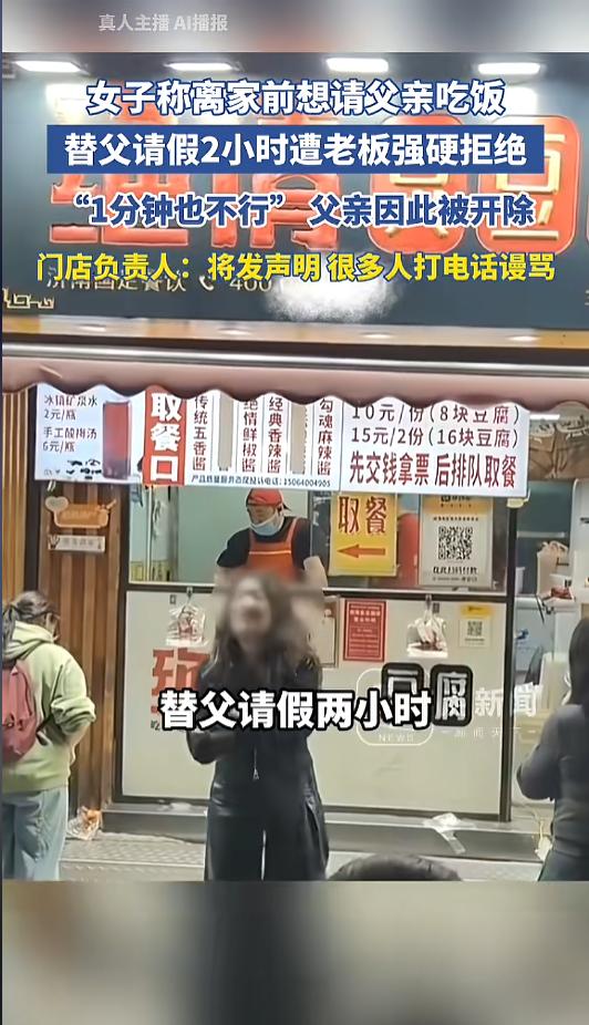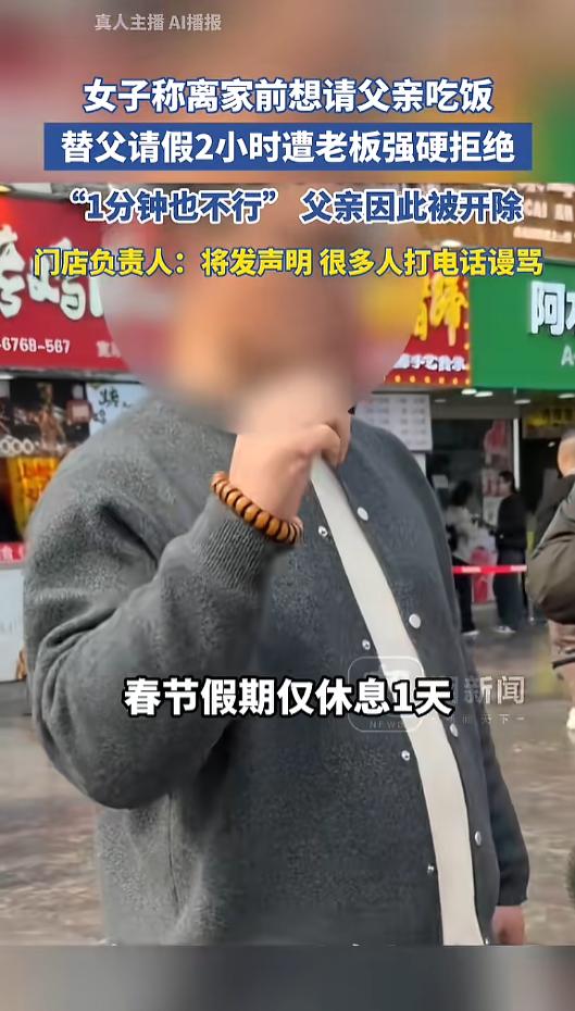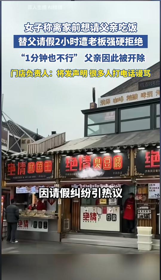 “一点人情味儿都没有?”近日,山东济南,一女子要回外地上班,临行前想跟自己的父亲吃一顿团圆饭,于是就打电话给父亲的老板,想请两个小时的假。谁知对方十分强硬地拒绝了,一分钟也不行!甚至打电话威胁女子父亲要开除他!网友:好好查查! 据媒体2月27日报道,李女士的父亲是一家臭豆腐店的炸锅师傅,每天都要忙到凌晨,春节期间就放了一天假。事发当日,李女士就要回外地上班了,临行前想再跟父亲吃一顿团圆饭。 于是李女士给父亲的老板打去了电话,希望能请假两小时,在晚上11点人少了之后就行。她也说,不白请假,可以扣工资。 没想到对方态度十分强硬,直接拒绝了,说“一分钟都不行!”不仅如此,对方还给李女士的父亲打去电话,威胁要开除他。 收到消息的李女士情绪十分崩溃,跑到父亲工作的臭豆腐店门口进行哭诉,言说整个春节自己就跟父亲吃上了一顿饭,引来了不少人围观。 舆论发酵后,商家回应都是不实信息,双方各执一词,当地人社局和街道已经介入调查。 网友看后表示,希望政府部门能尽快调查清楚,还公众一个真相。不冤枉一个好人,也绝不放过一个坏人!春节回家团圆,牵动着每个中国人的心! 信息来源:《女子称离家前想请父亲吃饭,替父请假2小时遭老板强硬拒绝,“1分钟也不行” 父亲因此被开除。门店负责人:将发声明 很多人打电话谩骂》潮新闻