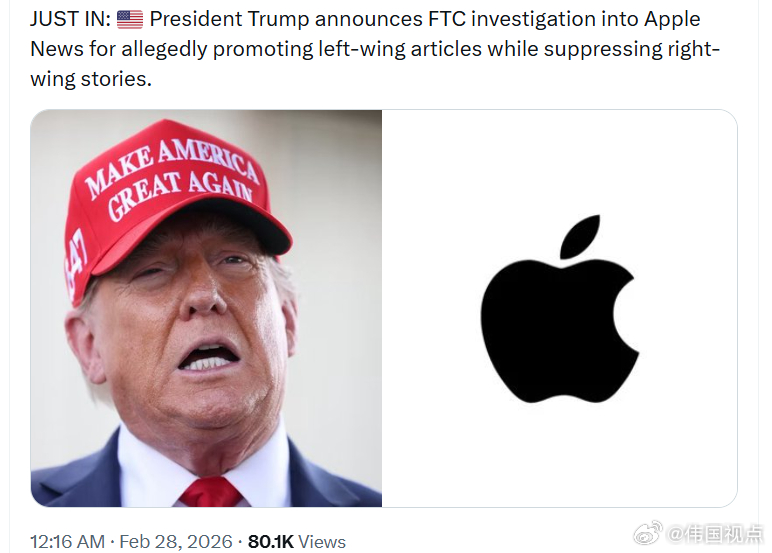 特朗普总统宣布,联邦贸易委员会将对苹果新闻进行调查,原因是其被指 推广左派文章,同时压制右派内容。
