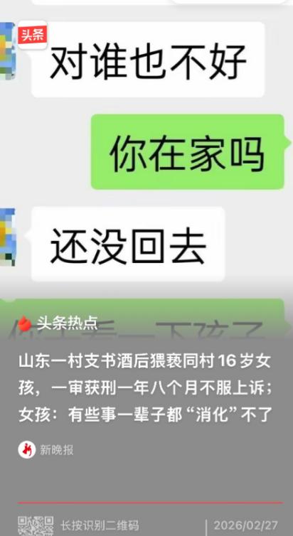 山东,一村支书去找村民干活,在发现村民不在家后,村支书让其女儿送自己出门,万万没想到,女孩刚把村支书送出门时,对方竟直接抱住了女孩,随即准备脱掉其内裤,在女孩奋力挣脱后,村支书便起身离开了,事发后,女孩报了警,村支书获刑1年8个月,但是村支书对此并不服气,不仅提起了上诉,还表示自己没做那些事。 山东平度发生的这起村支书侵害未成年人案件,每一个细节都让人愤怒又揪心。一个本该服务村民的基层干部,借着上门办事的名义,对留守家中的未成年女孩伸出黑手,即便法院已经作出判决,他依然拒不认罪、坚持上诉,而受害女孩却因为这次伤害,长期休学,心理上留下了难以愈合的伤口。 2025 年 7 月 23 日中午,50 多岁的村支书楚某喝了近二两白酒,随后以找村民帮忙干农活为由,前往村民家中。让人意外的是,楚某在去往村民家的路上,已经和外出干活的男主人迎面相遇,两人还简单打了招呼,他明明知道这家的男主人不在家,却还是径直走进了院门。 当时家里只有 16 岁的女孩兰兰和她的聋哑母亲,女孩见到村支书上门,没有丝毫防备,如实告知父亲已经外出干活。 按照正常逻辑,知道要找的人不在,楚某应该直接离开,可他并没有马上走。在院子里停留片刻后,他以家里的狗看起来吓人、自己害怕被咬为借口,提出让兰兰送他出门。兰兰年纪小,面对村支书的要求不敢拒绝,只能陪着他往门口走。谁也没想到,刚走到门口,楚某突然从身后抱住兰兰,将她强行扑倒在地,紧接着就动手撕扯女孩的衣物,甚至试图脱掉她的内裤。 突如其来的侵害让兰兰又怕又怒,她顾不上害怕,拼尽全力反抗,又踢又打,连续扇了楚某好几巴掌,一边反抗一边哭喊斥责。楚某见女孩激烈反抗,自己的行为无法继续,才起身匆匆离开现场。事发后,兰兰第一时间把遭遇告诉了家人,家人又气愤又心疼,带着女孩去找楚某讨要说法,可楚某却轻描淡写地辩解,说自己只是不小心碰到了女孩,根本没有猥亵的行为。 兰兰的爷爷曾联系村里的妇女主任,希望能得到帮助和处理,可对方却劝他们不要声张,说传出去对谁都不好。但家人没有被这种 “息事宁人” 的说法说服,他们清楚,沉默只会让施暴者更加肆无忌惮,也会让女孩受的委屈无处申诉。在家人的支持下,事发几天后,兰兰正式向警方报警,要求依法追究楚某的责任。 警方接到报案后,立刻展开全面调查,不仅固定了女孩的陈述、家人的证言等证据,还专门针对楚某所说的 “怕狗” 理由做了现场模拟实验。实验结果证明,兰兰家的几条狗性格温顺,并不会主动攻击人,楚某所谓的害怕被狗咬,完全是编造出来的借口。同时,监控记录、现场痕迹等多项证据形成完整链条,足以证实楚某强制猥亵的犯罪事实,即便他全程零口供,也不影响事实认定。 案件进入司法程序后,楚某在法庭上依然拒不承认犯罪,反复辩称自己是因为怕狗才不小心碰到女孩,不存在任何猥亵意图,还声称女孩一家是在诬陷自己。但法院审理后认为,楚某作为村支书,明知对方家中只有未成年女孩和残疾母亲,仍酒后借机实施侵害,行为已经构成强制猥亵罪,且侵害对象是未成年人,情节恶劣,理应从严惩处。 2026 年 1 月 22 日,平度市人民法院依法作出一审判决,以强制猥亵罪判处楚某有期徒刑一年八个月。 本以为法律的判决能给受害者一个交代,也能让楚某认识到自己的错误,可让人意想不到的是,楚某对判决结果完全不服,在法定时间内正式提起上诉,坚持声称自己没有犯罪,试图逃避应有的惩罚。 而另一边,受害者兰兰因为这次遭遇,承受着巨大的心理压力,出现了严重的心理创伤,不得不长期休学在家,无法正常学习和生活。她曾说,有些伤害不是时间能抹平的,一辈子都难以释怀。 这起案件看似发生在乡村的小范围里,却折射出很现实的问题。基层干部手握村民赋予的信任,本该是守护一方平安、帮助弱势群体的人,可楚某却把这份信任当成了作恶的底气,专门挑选家中无成年男性、母亲有残疾的未成年女孩下手,行为突破了道德底线,也践踏了法律红线。 更让人无奈的是,事发后还有人劝受害者息事宁人,仿佛受到伤害的人要为施暴者的错误藏着掖着,这种错误的观念,往往会让受害者二次受伤。 法律对未成年人的保护是零容忍的,不管身份如何、地位如何,只要触碰了侵害未成年人的红线,就必然会受到法律的制裁。楚某的上诉,不会改变已经查实的犯罪事实,也不会抵消他给女孩带来的伤害。正义或许需要时间,但绝不会缺席,法律会用最公正的结果,给受害者一个交代,也给全社会一个警示。 权力再小,也不能用来作恶;身份再特殊,也不能凌驾于法律之上。面对侵害,勇敢站出来不是丢人,而是保护自己、惩治恶行的最正确方式。 我们也希望,所有未成年人都能被温柔守护,所有施暴者都能被依法严惩,不要再让类似的悲剧,发生在任何一个孩子身上。