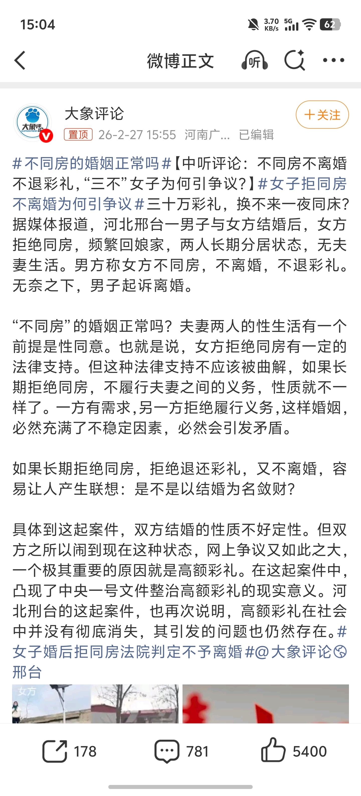 不同房的婚姻正常吗这不是废话么?根本不同讨论,100%不正常啊。结婚了,有了夫妻名分,同房是自然而然的。