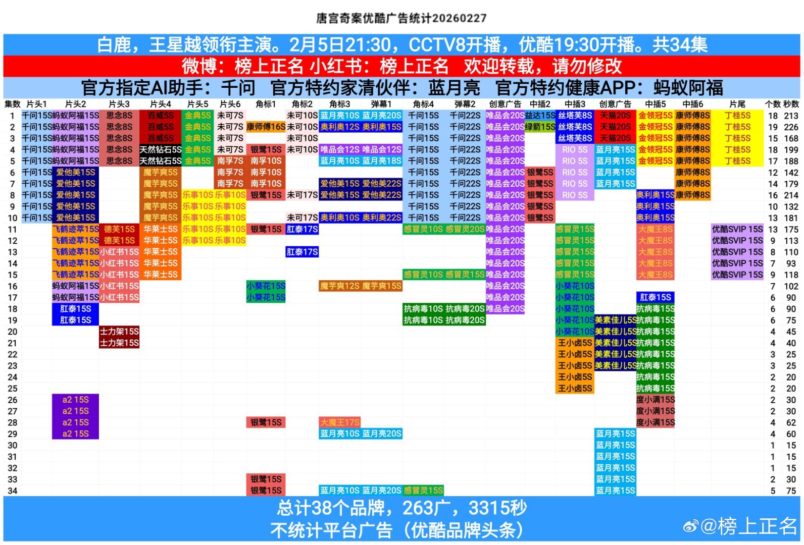 不得不说一句,白鹿伟大!无IP、无营销、无合作演员加持,凭一己之力扛剧、扛招商、扛热度。在日活仅为别家三分之一的优酷,唐宫奇案硬生生连日夺冠,横扫全网各大榜单。视频广告超2000秒,全部广告破3000秒,商业号召力一骑绝尘。白鹿自己就是白鹿的硬底气!