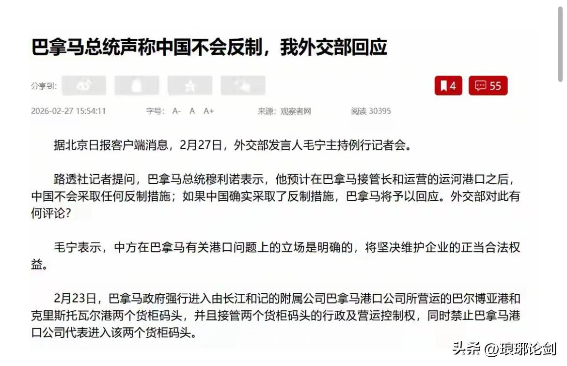 强抢中资港口还放狠话!巴拿马哪来的底气反咬中国? 真把我看笑了!抢了中国人的港口,还敢警告我们敢反制就回击,谁给的胆子? 2026年2月23日,巴拿马政府直接动手,强行清场接管长和运营近30年的两大核心港口,无通知、无协商、无补偿。 长和1997年中标、2021年合法续约到2047年,累计砸进去18亿美元,一夜之间被连根拔起,转头交给欧洲船公司运营18个月。 最嚣张的是巴总统穆利诺,公开放话:我笃定中国不敢反制,真敢动手,巴方必回击,后果自负。 他的自信说白了就三点:美国撑腰、赌我们忍气吞声、高估运河不可替代。 但他算错了三本账: ✅ 中国是运河第二大用户,约5%全球货轮走这里,我们一调整航线,巴方单月过境费直接少赚2300万美元。 ✅ 巴农产品67%出口中国,海关一严检,他们的香蕉咖啡根本卖不动。 ✅ 长和已启动国际仲裁,索赔30-50亿美元,巴方国家信誉直接破产。 2月27日外交部重磅表态:将坚决维护中国企业正当合法权益。 话不多,但分量拉满——我们不惹事,但绝不吃亏,反制已经在路上。 巴拿马现在是抱着美国大腿玩火,短期捞好处,长期必被反噬。契约精神踩碎,外资全吓跑,最后哭着求合作的,一定是他们。 想看更多硬核国际解读,关注我不迷路,持续更新不踩坑!