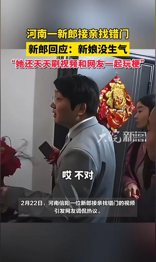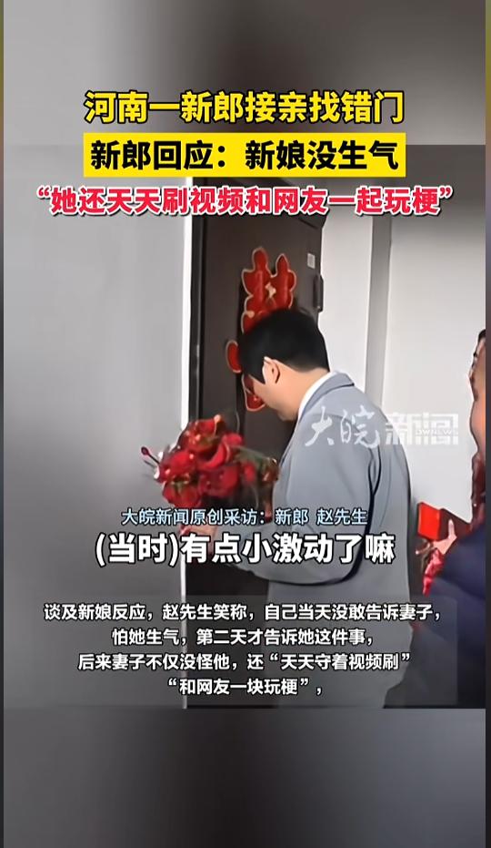 “实在太尴尬了!”近日,河南信阳,一男子新婚,接亲时居然找错了门。新娘住在四楼,他却跑到六楼接亲去了,把人家住户都给整懵了。男子担心新娘生气,也没敢告诉她。没想到最后还是让新娘知道了。网友:咋滴,媳妇儿不想要了? 结婚可是人生中一等一的大事,前前后后需要详尽的谋划,不过也有一些人太过紧张,在这一天整出些乌龙事件,让人忍俊不禁。 据媒体2月26日报道,新郎赵先生的妻子,是从外地远嫁过来的,租住在一家民宿里,就住了一晚上。接亲当日,赵先生太过激动,带着亲友噌噌的就爬上了六楼。 敲开门一看,赵先生傻眼了,哪里有新娘影子。六楼的住户看着眼前接亲的队伍,也是一个头两个大。赵先生赶紧掏出手机,一通翻找之下,才发现自己找错了地方。 原来,新娘子订的民宿是四楼。赵先生给人家道完歉,赶紧下了楼。接到新娘子后,赵先生担心妻子生气,没敢把这件事告诉她。 赵先生自己说,他和妻子两个人都比较社恐,结婚也没有请婚庆公司,就只叫了几个自己的好友。没想到,当天的视频被好友发到了网上,还让妻子刷视频刷到了。 不过妻子看到后并没有生气,反而还一起看视频玩梗,这让赵先生感到非常感动。 网友看后表示,新娘子脾气真好,这么通情达理,新郎可有福了。也祝愿两个人和和美美,永远幸福! 信息来源:《河南一新郎接亲找错门 新郎回应:新娘没生气 “她还天天刷视频和网友一起玩梗”(原创采访)》大皖新闻