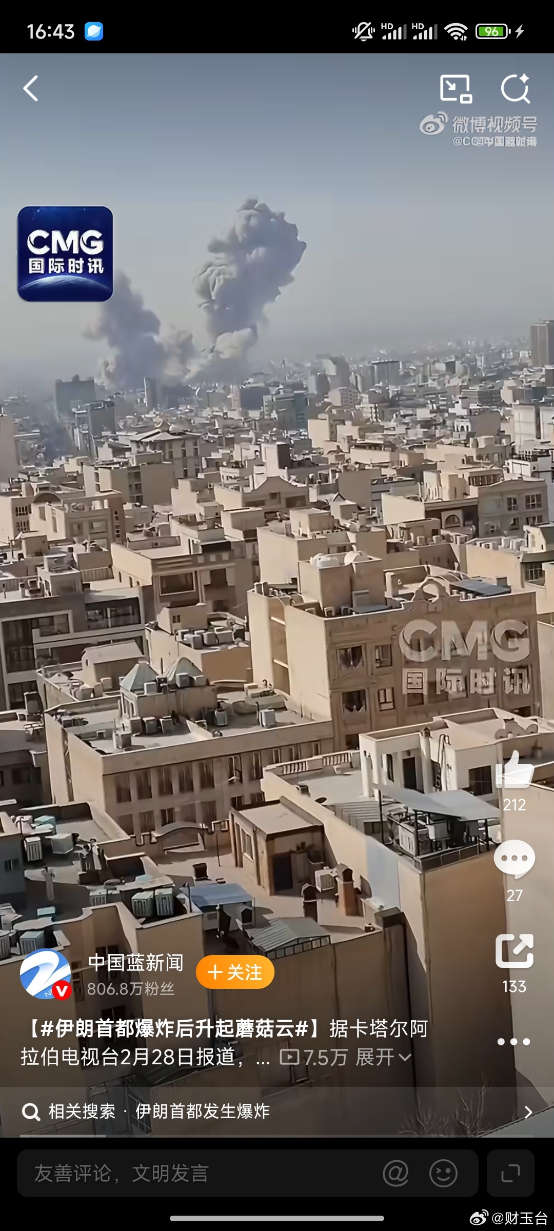 伊朗首都爆炸后升起蘑菇云德黑兰上空蘑菇云冲天,中东局势骤然拉响最高警报。以色列宣布对伊朗发动“先发制人打击”,多目标遭袭,地区冲突全面升级,平民安全与地区稳定面临严峻考验。战争从来没有赢家,军事对抗只会带来更多伤亡与动荡。国际社会应立即劝和促谈,推动双方停火止战,避免局势进一步失控外溢,守护中东来之不易的和平与安宁。愿战火平息,平民平安,冲突重回政治解决轨道。