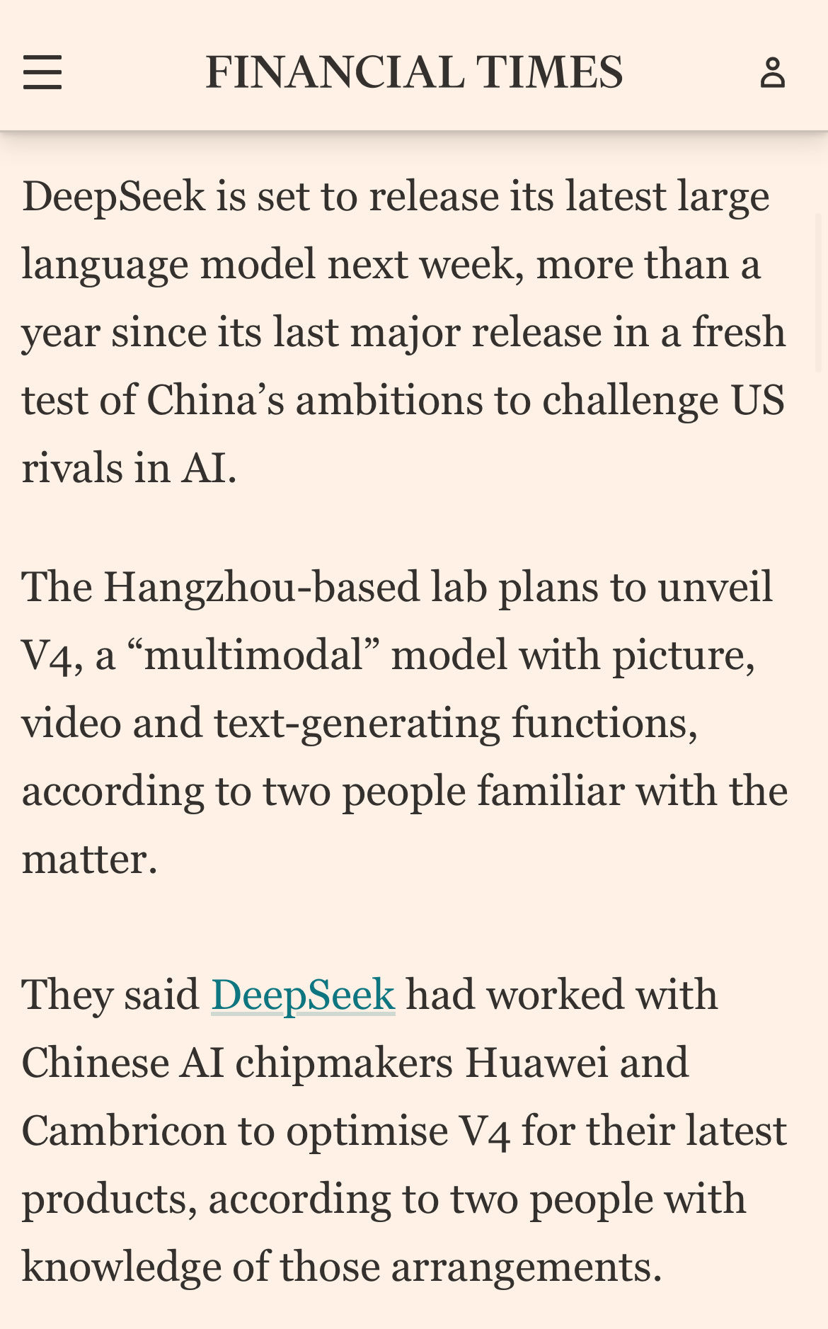 FT:DeepSeek V4 下周发布,原生多模态。和华为、寒武纪联合优化,估计是优化了 V4 在对应平台上的推理性能。