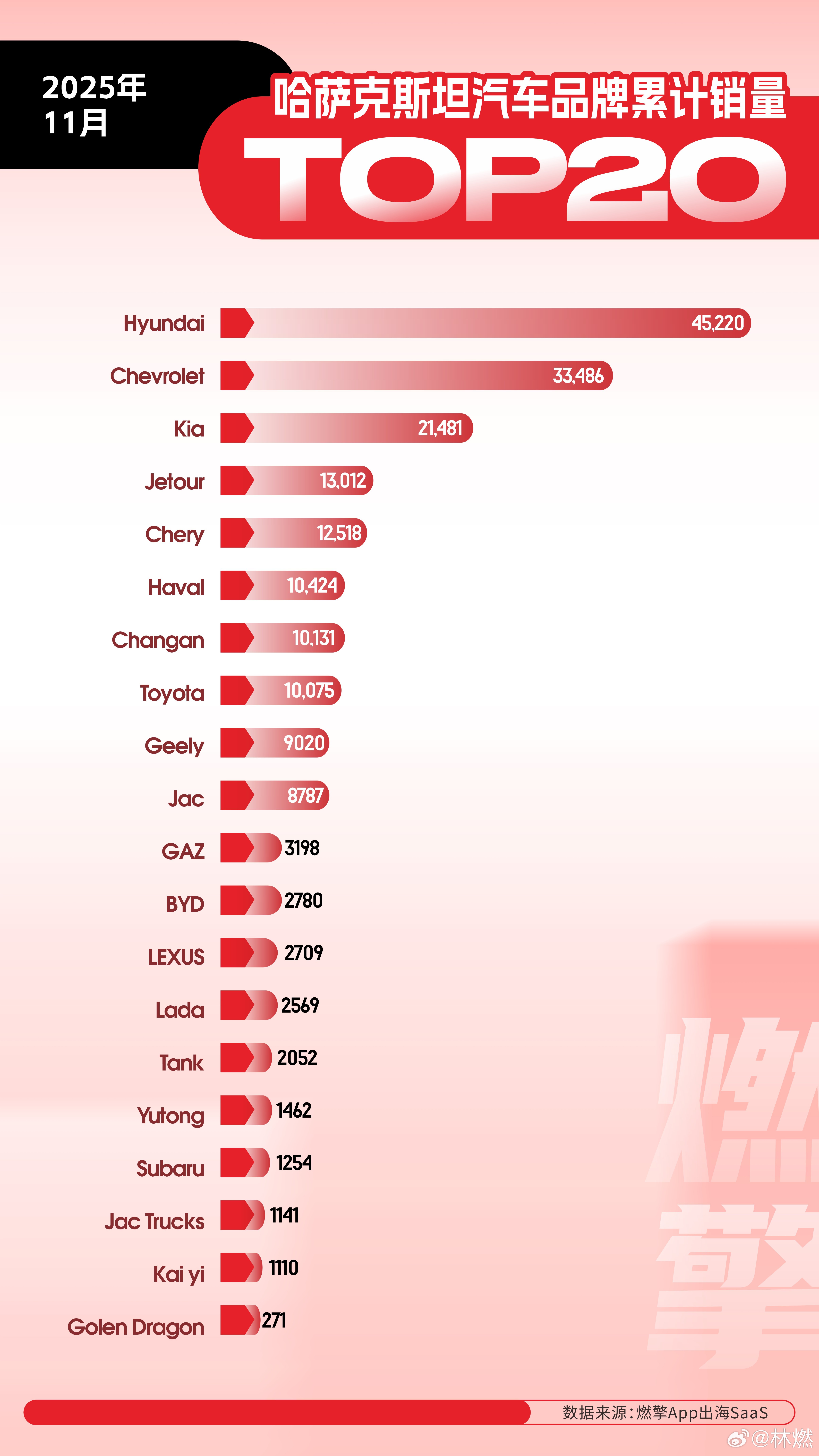 从2025年前11个月的累计销量来看,哈萨克斯坦汽车市场的全年格局已经清晰成型。与单月数据的瞬时表现不同,这份累计榜单更真实地反映了各品牌在当地市场的长期竞争力:——韩系品牌完成反超并登顶,美系雪佛兰退居次席,而中国品牌则以集群姿态强势崛起,成为市场第三极。