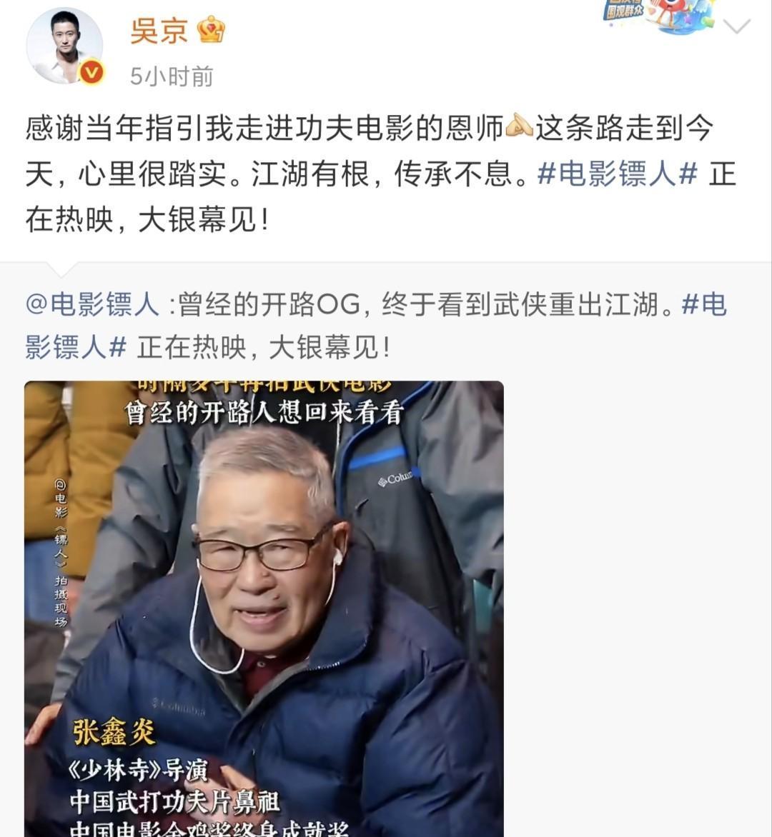 你猜怎么着,台上是战狼,台下是赤子。 九十一岁的恩师拄拐一来,吴京扑通一跪,直接扑上前死死抱住。 那双攥住恩师的手腕都在抖,眼神哪还有半点杀气,全是徒弟见着师父的滚烫。 这师父叫张鑫炎。 是他,一手拍出《少林寺》,把李连杰捧成神话;也是他,把毛头小子吴京领进了武侠的门。 老爷子最后一趟公开露面,是去《镖人》剧组镇场子。 他话不多,就在那儿坐着,整个片场的魂儿就稳了。 他总说,武侠的里子不是特效,是握刀的手,是报仇的路,是挺直的脊梁骨。 这些东西,得靠人,一代一代手把手地传。 台上是拳脚打出的江山,台下是双膝跪地的传承。 一个跪下去,一个时代立起来了。