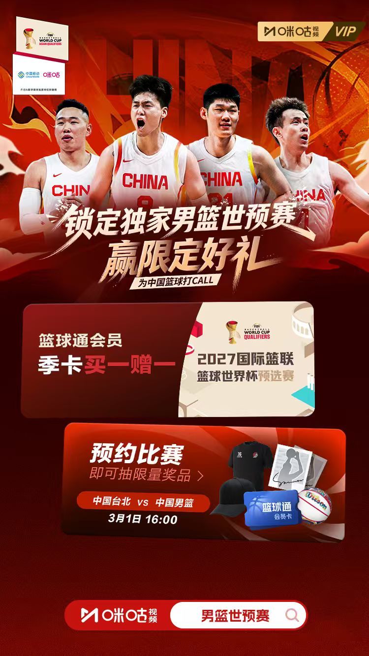 #独家看男篮世预赛就在咪咕# 3月1日16:00 中国台北男篮vs中国男篮客场逆转日本,见证团结一心💪此番对阵中国台北男篮,为中国篮球加油!🎁上咪咕预约本场比赛即可参与抽奖,篮球通月卡、年卡、中国男篮签名照片等你来!