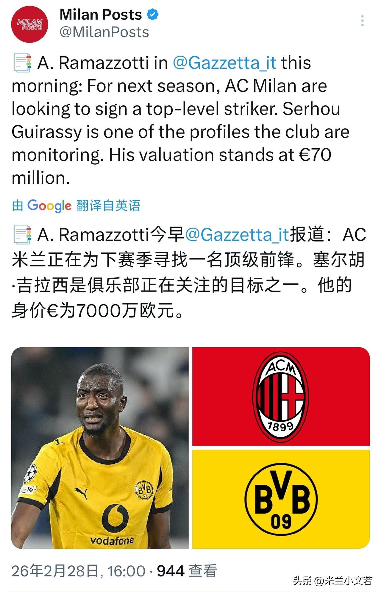 吉拉西!米兰会在夏季窗口继续寻找合适的锋线球员,之前与米兰传出过绯闻的多特蒙德球员吉拉西是米兰夏季窗口目标球员之一。 我也不知道我们财政状况到底是好还是不好,俱乐部天天说的是财务紧张,但转会市场是真的看不出来,很多球员都是价格合适的时候不考虑,价格到了高位需要接盘时候米兰到很积极,现在有点糊涂,我们财务状况到底是良好还是不良好? 米兰与吉拉西传出绯闻的那个夏季窗口,吉拉西并不是米兰的第一目标球员,当时米兰的第一目标球员是齐尔克泽,我们跟齐尔克泽磨了一个夏天,最后被霍拉布钦给当抬价工具了,当时谈不下来就该换目标,非要盯着齐尔克泽,一个进禁区就害怕的球员,当时大部分米兰球迷都不理解为啥买齐尔克泽,那时候吉拉西才1700万欧元,现在?多特蒙德这样的黑店6000万以下会卖。