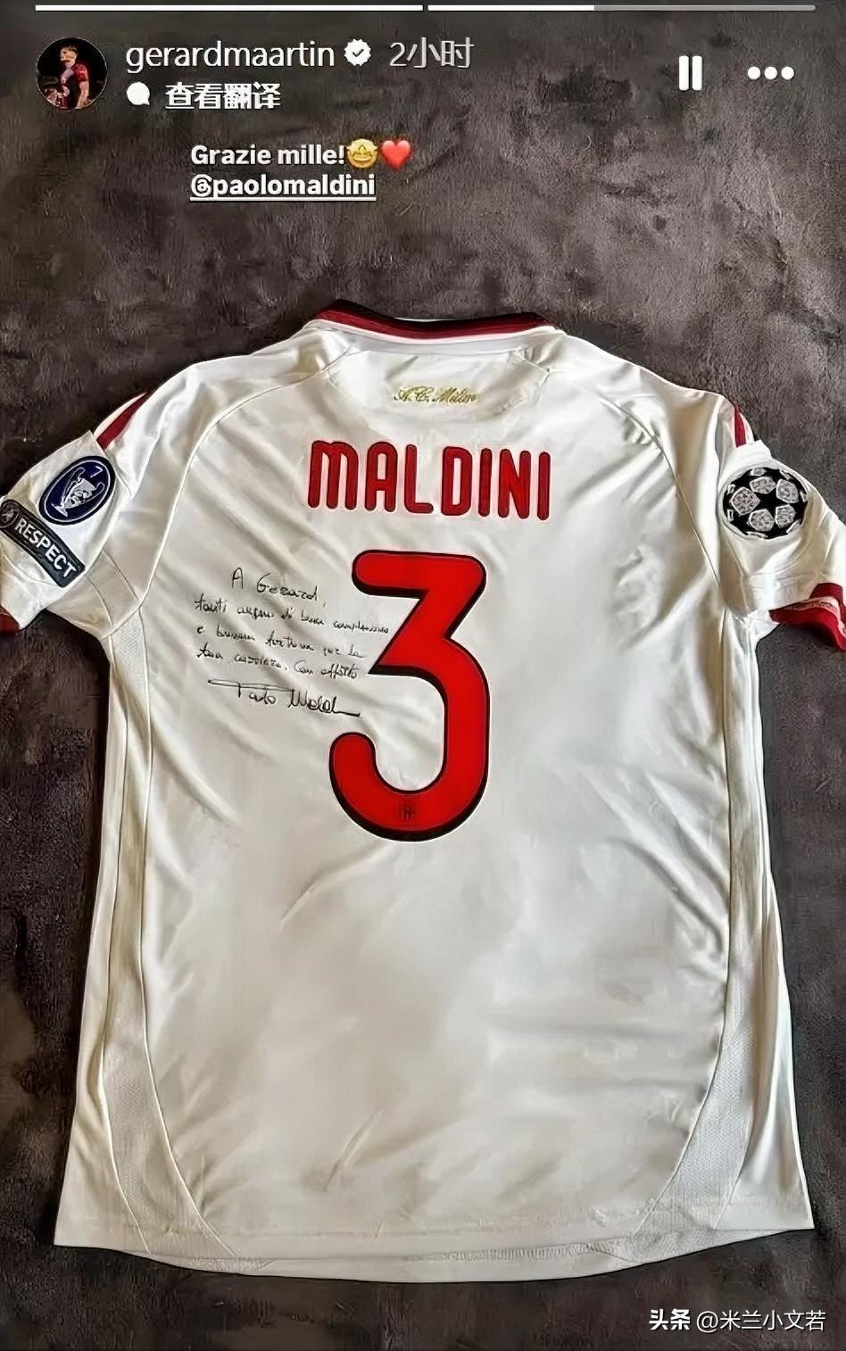 巴塞罗那俱乐部后卫球员赫拉德·马丁晒马尔蒂尼赠送的生日礼物。这个赫拉德·马丁是米兰夏季窗口的目标球员,在冬季窗口时候米兰曾经试图引进赫拉德·马丁。 巴塞罗那后卫球员赫拉德·马丁24岁生日,在社交媒体上,他晒出了一份特别的礼物,那就是传奇后卫马尔蒂尼的亲笔签名球衣。对于后辈,马尔蒂尼在签名球衣上进行了鼓励,他写道:致赫拉德,祝你生日快乐,也祝你职业生涯一切顺利。谨致问候,保罗·马尔蒂尼。马丁在社媒上则写道:万分感谢!赫拉德·马丁在青年队就与队长相识,赫拉德·马丁视马尔蒂尼为偶像,马尔蒂尼也十分喜爱这位后辈,他们经常谈论关于足球的问题。 这个赫拉德·马丁之前就无数次说过马尔蒂尼是他的偶像,他从青年队就每天看着马尔蒂尼踢球的录像睡觉,在冬季窗口米兰询问赫拉德·马丁的时候他就表达过可以加盟米兰是令人开心的事情,唯一遗憾就是不能在米兰看到马尔蒂尼。这个孩子可能不是米兰球迷,至少他没说过他是米兰球迷,但他真的是马尔蒂尼的人迷,他从青年队就与马尔蒂尼取得了联系,他会经常请教马尔蒂尼关于足球的问题,最著名的就是马尔蒂尼伴我入睡,他睡觉时候需要看着马尔蒂尼的比赛录像,才能安心睡下。