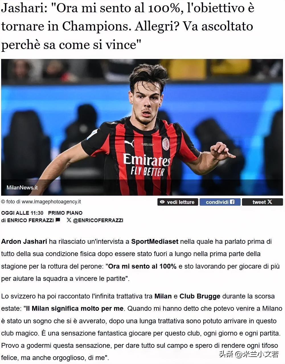 加沙里!加沙里接受采访表示自己现在感觉好极了,已经完全恢复到了自己最好的状态,希望下半赛季可以努力争取更多上场时间,帮助球队去赢得更多的比赛。 加沙里同时表达他不喜欢在家看欧冠,如果非要看也是看米兰的欧冠比赛,米兰对我而言意义重大。当我知道我有机会加盟米兰的时候,我是迫不及待的,也许就是因为我的态度才令谈判经过了漫长的过程,好在我终于来到了这家神奇的俱乐部。为这家俱乐部效力,每一天、每一场比赛都是一种奇妙的感觉。我试着享受这种感觉,以便在球场上付出一切,我希望能让每一位球迷对我感到满意,甚至骄傲。 我一直都觉得这个孩子情商高,看看他每次接受采访的内容,他的话可以令不同的人都能感到满意,表明自己是米兰球迷,对米兰推崇备至,还希望能给球迷带来快乐与骄傲,这在球迷眼里就是满分表现,然后把谈判问题归因在自己态度上,而不是弗拉尼会计的无能,领导能不喜欢?这样的情商智商打中场肯定没问题,米兰之前情商高的特别是情商高的中场球员基本都表现出色,期待加沙里是又一个中场核心。