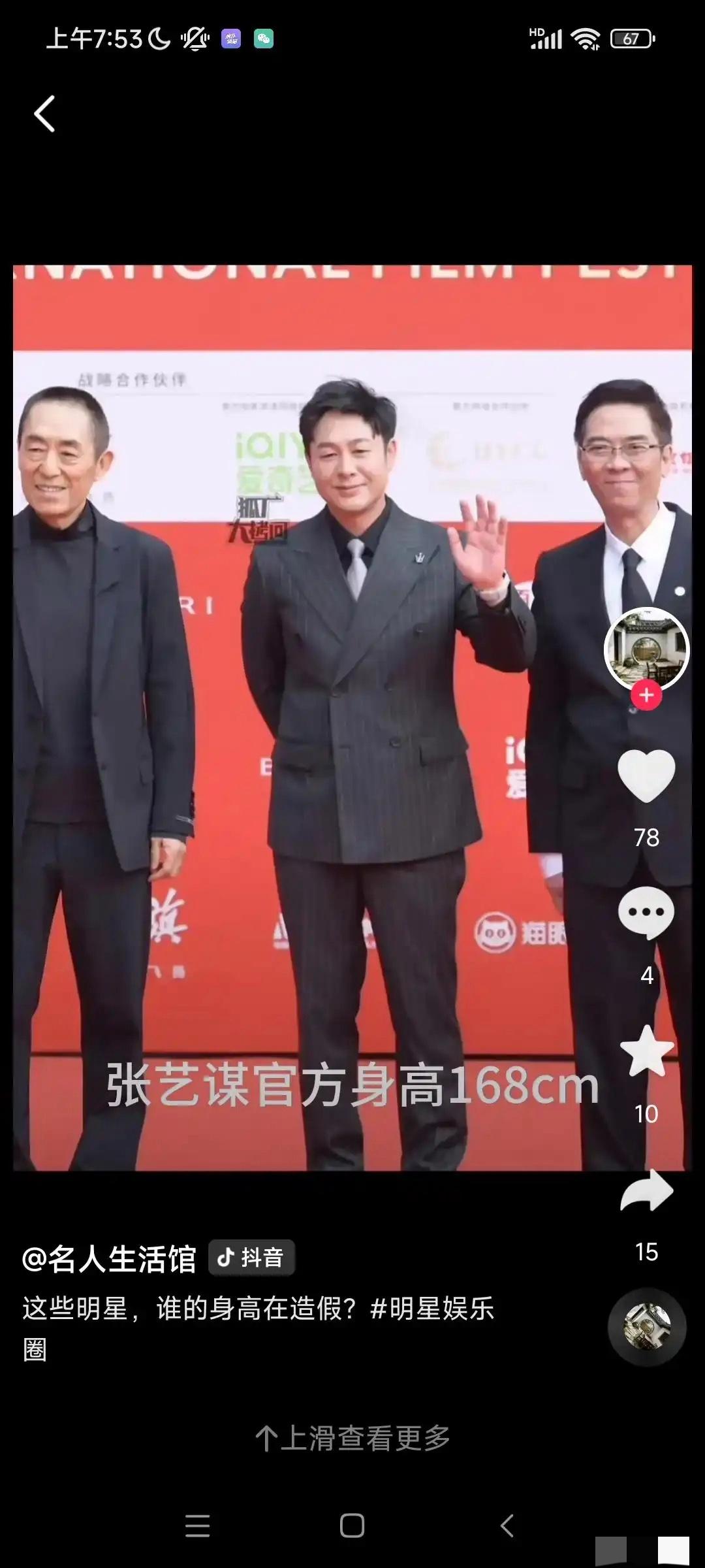 张艺谋导演身高是168标杆,然而自报174的谢霆锋和自报175的张颂文站在张导面前都显了原形,就算谢霆锋低头照顾了张导,身高也高不过172,张颂文更是实际光脚168的身板