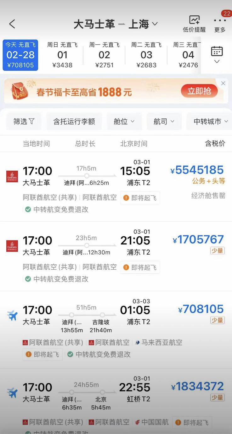 由于伊朗和以色列的冲突爆发,大马士革飞往上海的机票暴涨至最高554万元! 不过这是头等舱的价格,其他舱段没有这么贵,但是最便宜的票价也需要70万元。 不过从明天开始票价就恢复了正常,有相关需求的人可以经第三国中转回国,这是没有任何问题的。 各位是怎么看的?欢迎评论区留言。