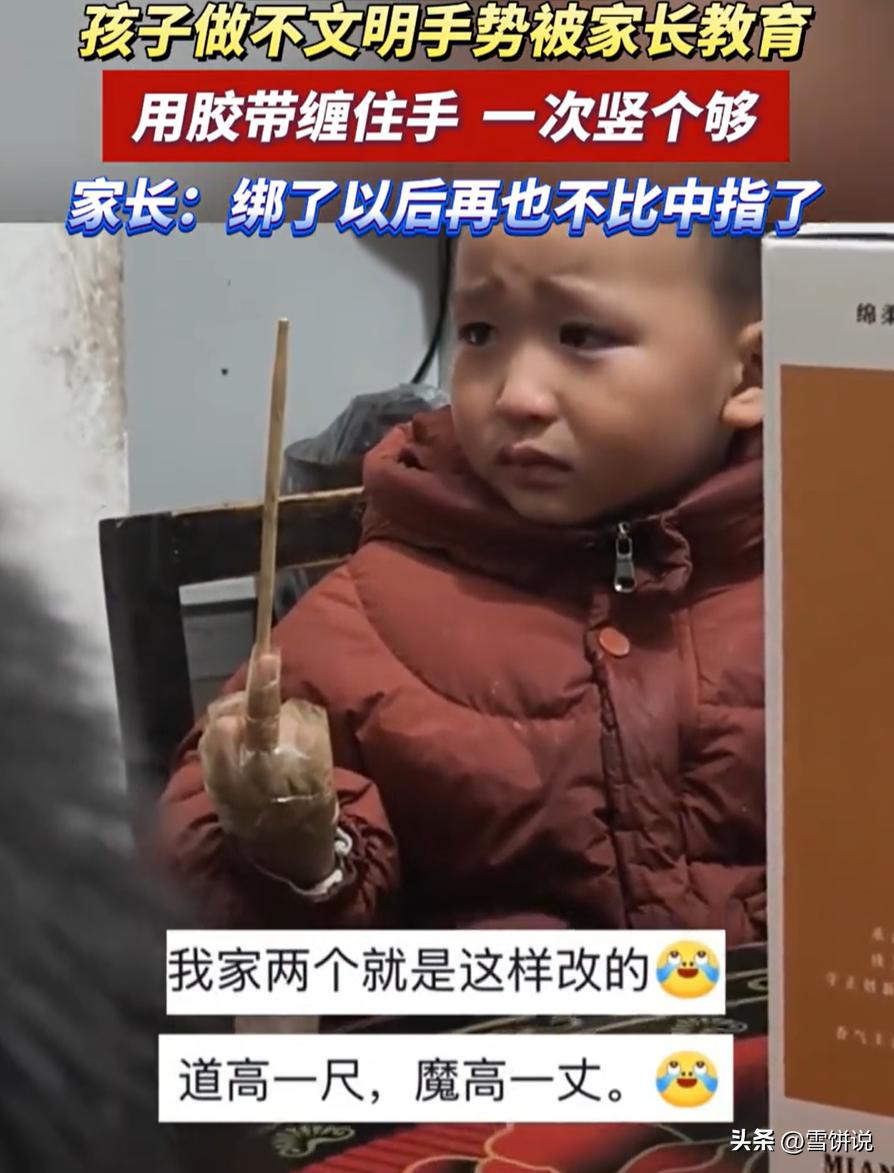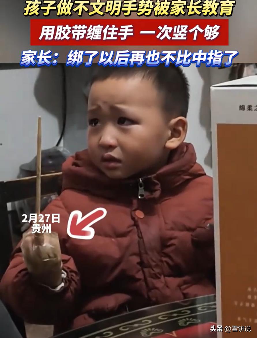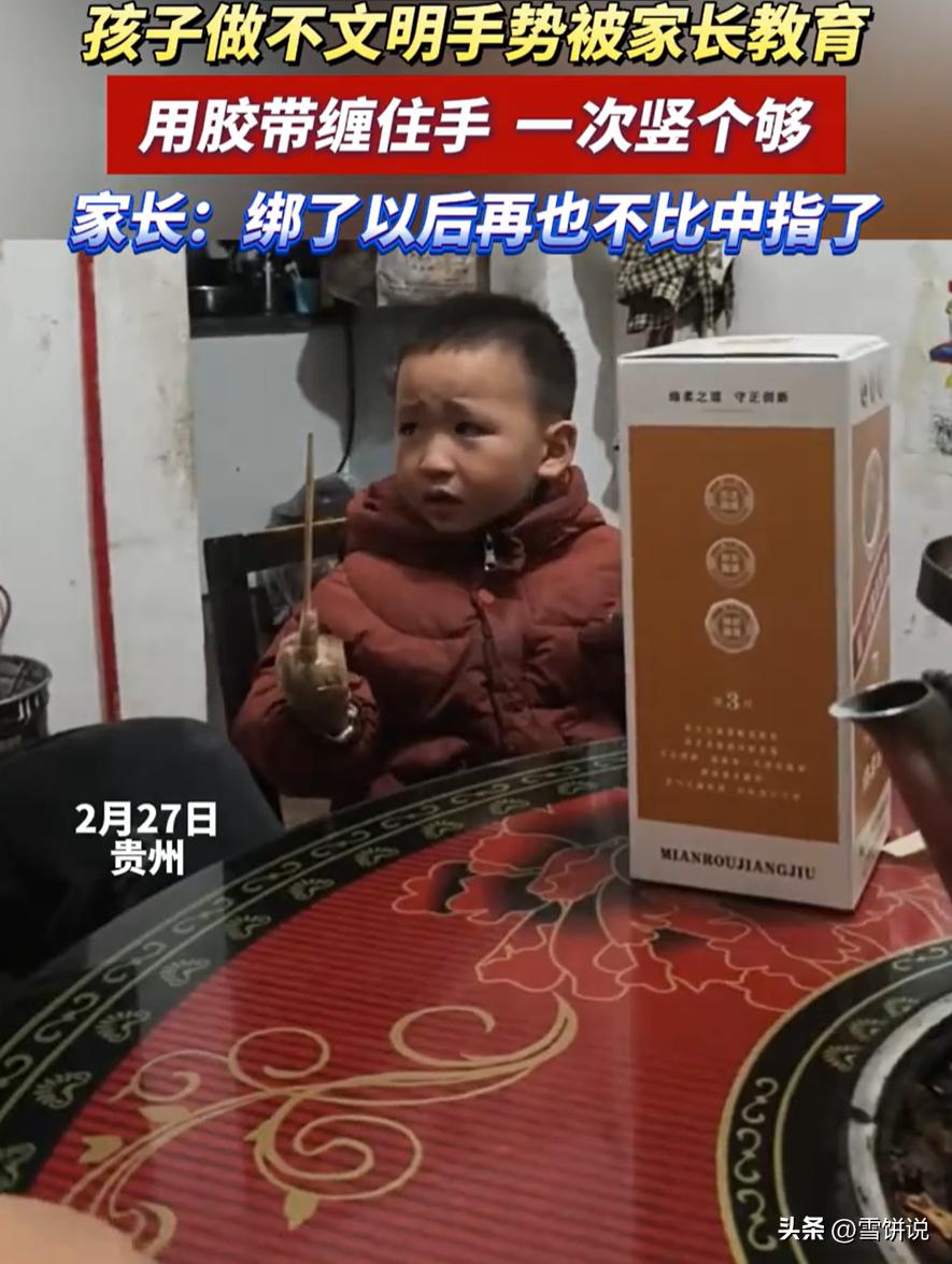 这就对了!贵州,男孩在家玩耍时,突然对着父母做了一个不文明手势,脸上还嬉皮笑脸,母亲看到后并没有直接打骂,反而扎了根筷子,把他手固定住,让他一次做个够,这下男孩彻底长教训了 当天,孩子在家玩嗨了,突然对着爸妈比了个不文明手势,脸上还笑嘻嘻的,一副欠收拾的表情,一般家长看到这一幕,第一反应要么是暴跳如雷一顿打,要么是劈头盖脸一顿骂。但这孩子妈妈的做法,让人眼前一亮 她没打也没骂,转身去厨房拿了根筷子,把孩子的手固定住,让他保持那个手势,做个够 孩子刚开始可能还觉得好玩,但手一直举着,时间一长,胳膊酸了,笑容也没了,最后只剩下委屈巴巴的求饶。这下好了,一次就记住了,估计这辈子比划这个手势前都得想想那天胳膊有多酸 说实在的,这位妈妈的做法高明在哪?她用了一种最直观的方式,让孩子亲身体会什么叫自食其果。你不是喜欢做这个动作吗?那就做个够,做到你自己觉得没意思,做到你自己受不了。这种教育方式比打骂有效多了,因为孩子记住的不是疼痛和恐惧,而是这个行为本身带来的后果 生活中经常看到一些家长,孩子犯了错,要么不管不顾,要么就简单粗暴地收拾一顿。打完了骂完了,孩子可能暂时不敢了,但未必真正明白错在哪 更糟糕的是,有些家长完全不当回事,觉得孩子小不懂事,长大就好了。可问题是,有些习惯一旦养成,长大想改就难了 这位妈妈的做法给了我们一个启发:教育孩子,有时候需要的不是暴风骤雨,而是有点创意的耐心。让孩子为自己的行为承担自然后果,这种教训往往比说教深刻得多