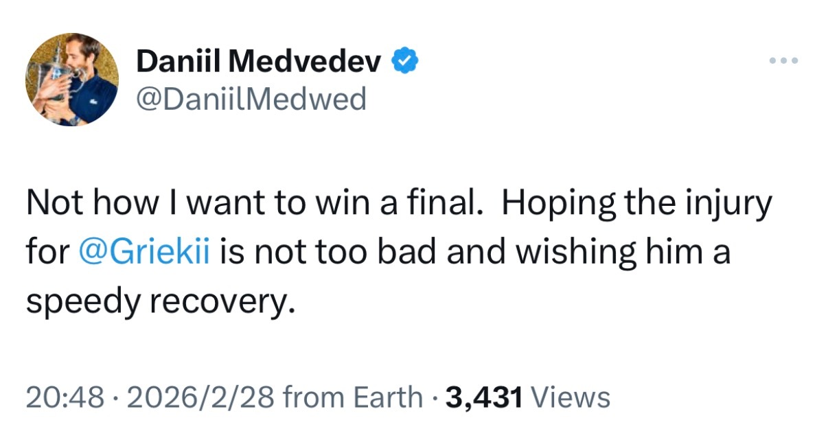 Breaking News:ATP迪拜站决赛无缘上演,荷兰球员格里克斯普尔因伤退赛,梅德韦杰夫不战而胜收获冠军,拿到职业生涯第23座冠军,第一次在同一座城市两次夺冠🏆