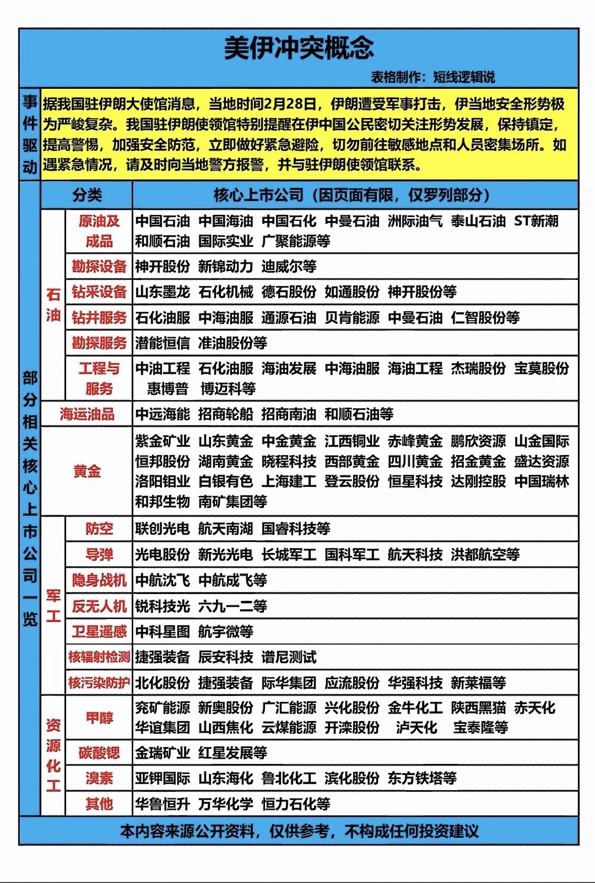 看到这张列出美伊冲突相关上市公司的图,还挺有感触的。美伊冲突这种国际事件,对相关上市公司的影响可不小。就拿军工类公司来说,冲突一起,武器装备需求可能增加,相关企业订单或许就会变多,股价也可能跟着涨。比如有些生产导弹零部件、军事通信设备的公司,在冲突期间业绩可能会有明显提升。但这背后其实也有风险,国际局势变幻莫测,一旦冲突缓和,这些公司的热度可能就会降下来。所以投资这类公司,得时刻盯着国际形势,不然一不小心就可能“踩坑”。