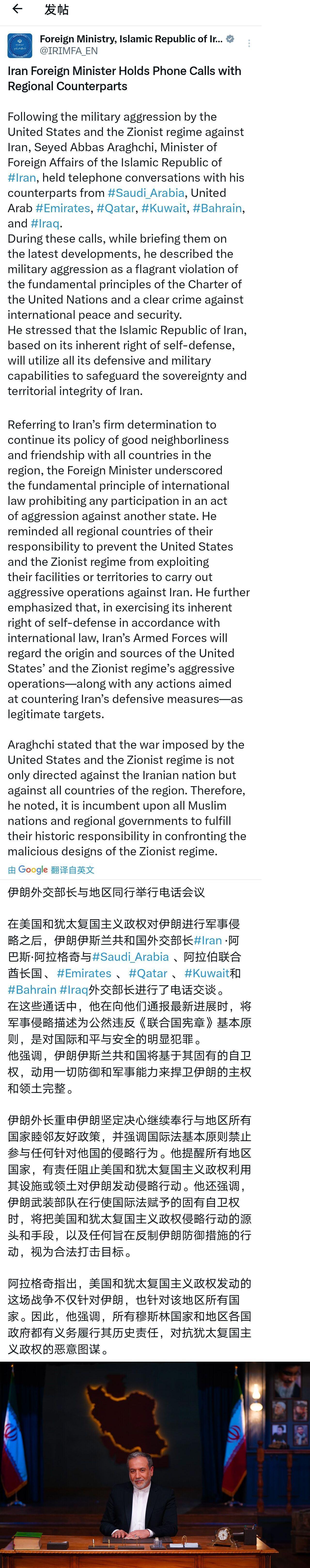 伊朗外交部最新情况通报! 袭击美国在中东五国的军事基地后,伊朗外长与域内六国通话 —— 沙特、阿联酋、卡塔尔、科威特、巴林、伊拉克称: 他们发起的袭击是“自卫”。 没错!以色列先袭击伊朗如果是“自卫”的话,伊朗打击中东的美军基地,当然也是“自卫”啊! Source: X