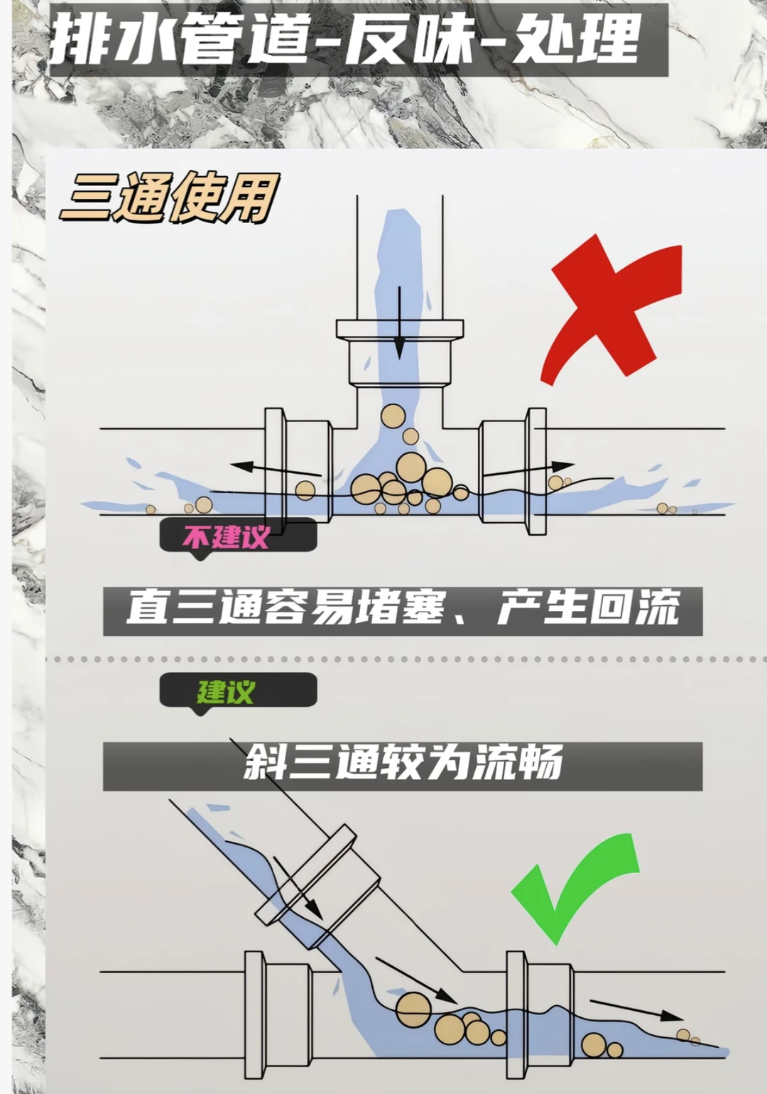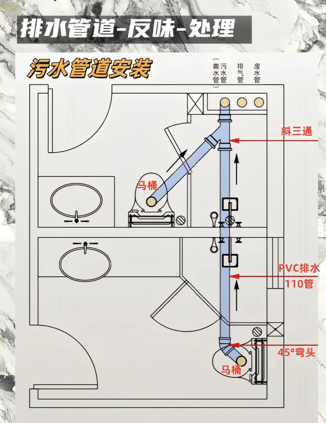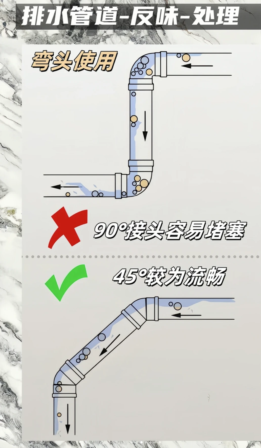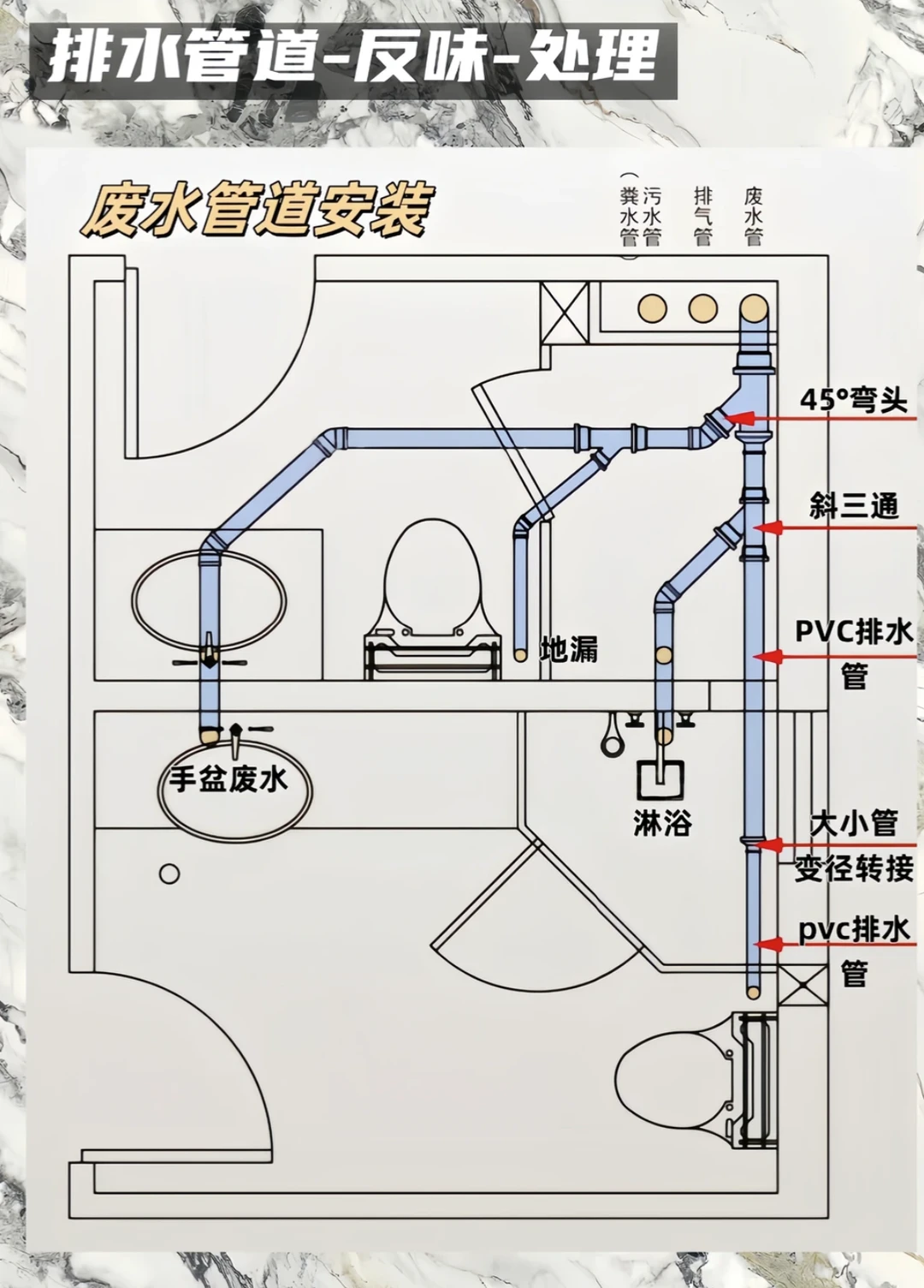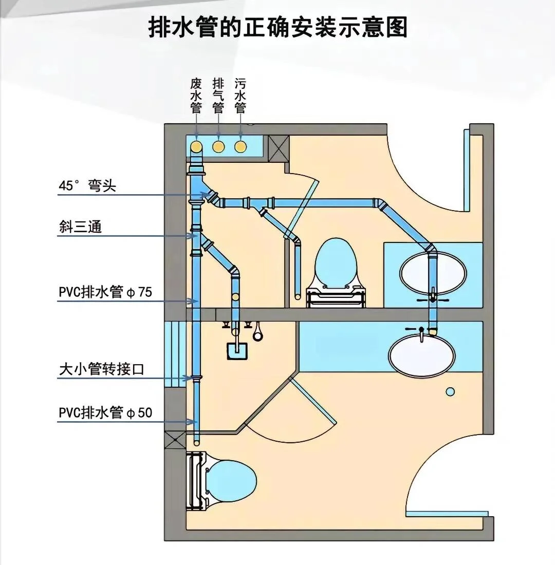 💡 避坑总结 - 三通选斜不选正 - 弯头用45°不用90° - 管径110做主排污,75/50做废水 - 管道必须有标准坡度 - 所有排水口都要有存水弯 装修是个细活,排水更是隐蔽工程,千万别图省事!把这些细节做好,才能拥有一个干爽无异味的卫生间~