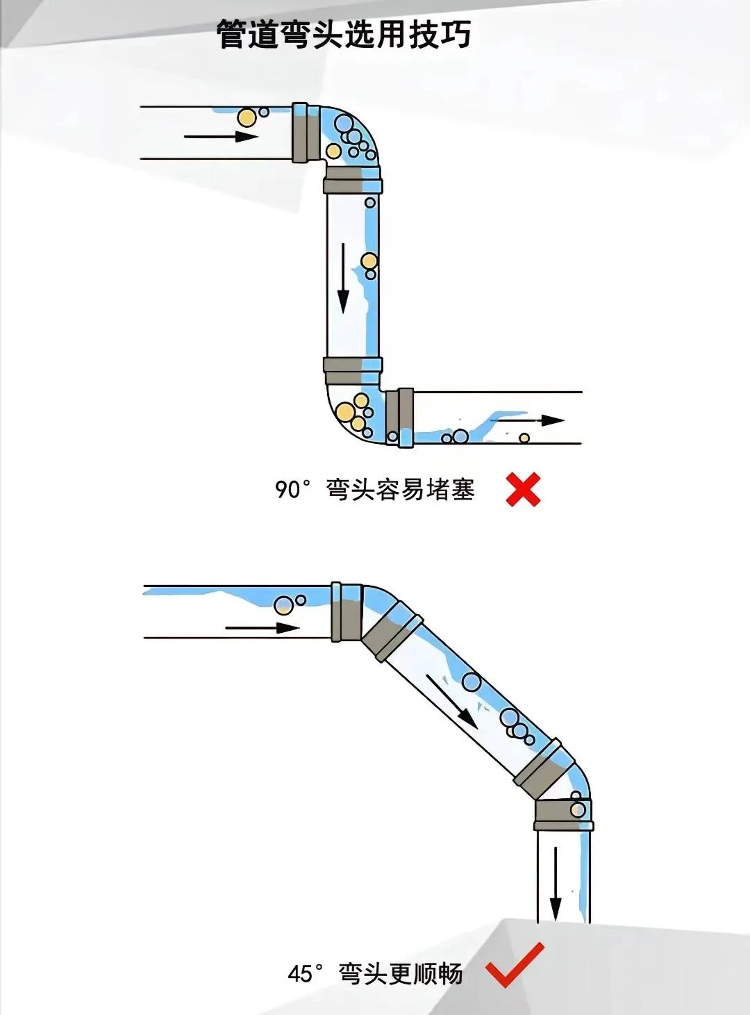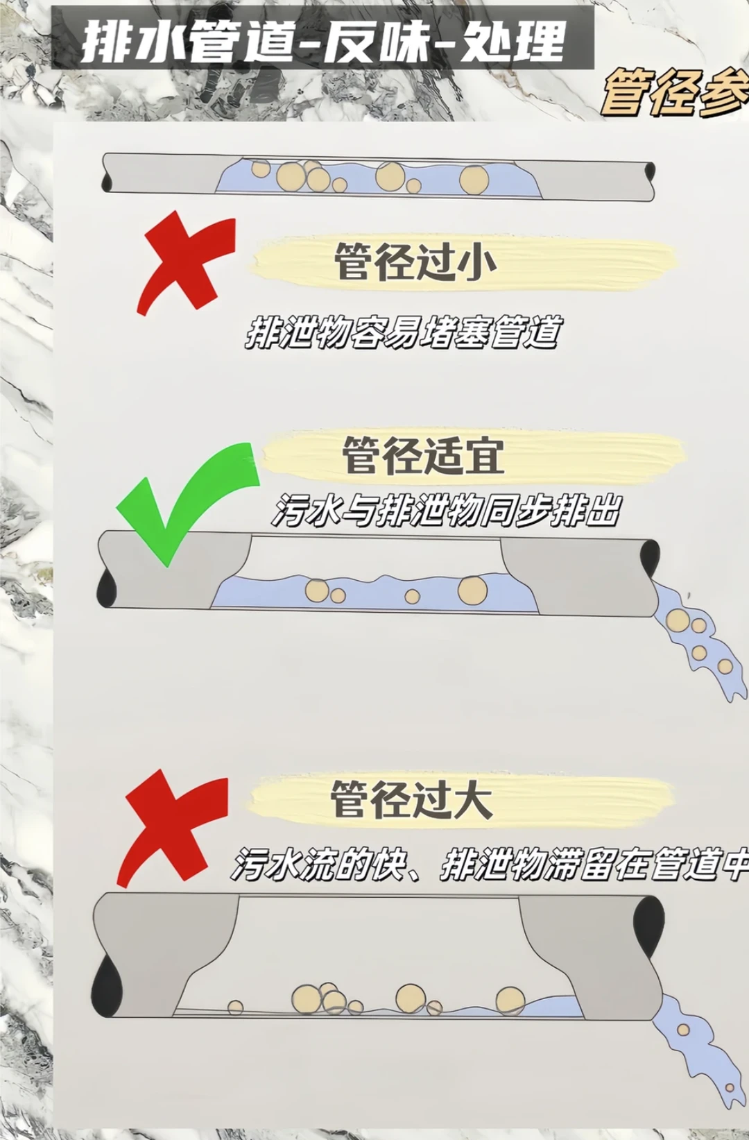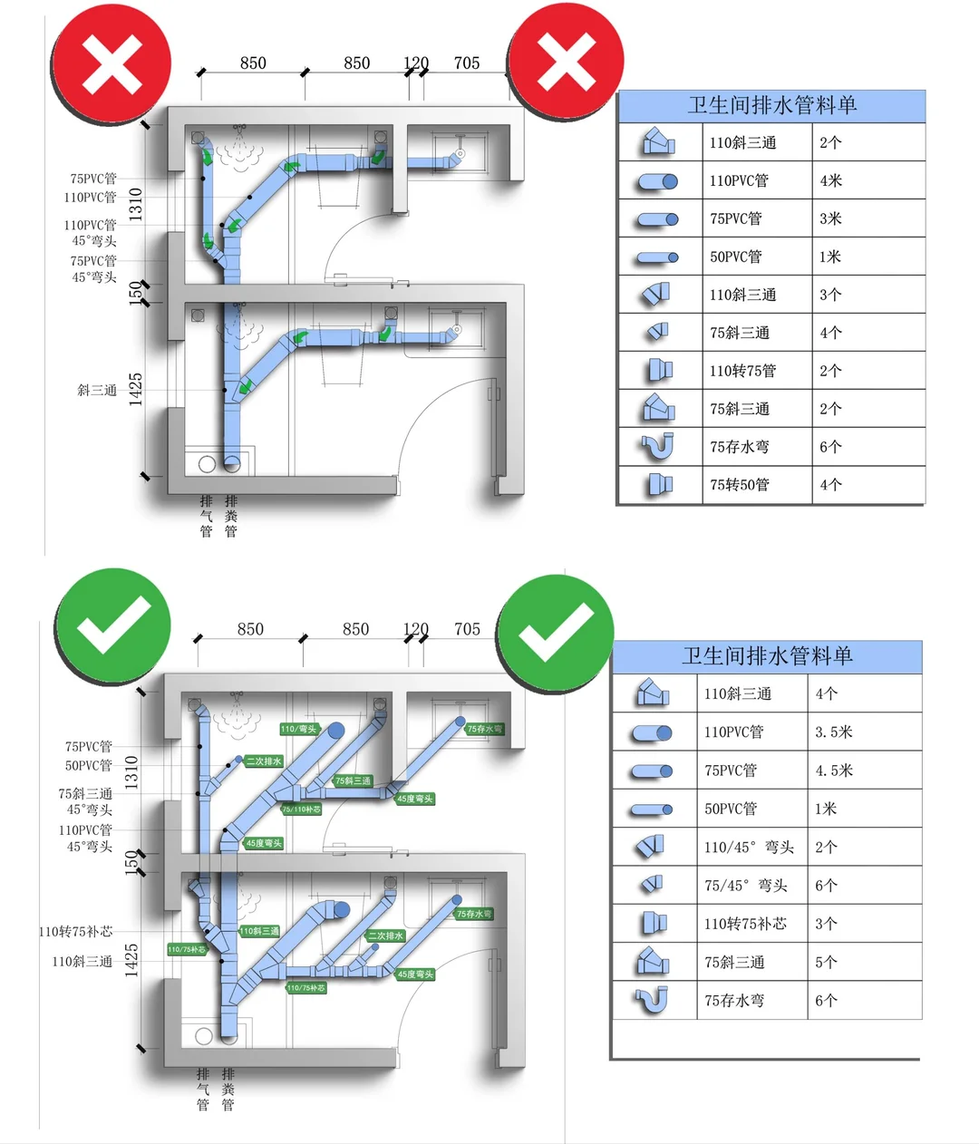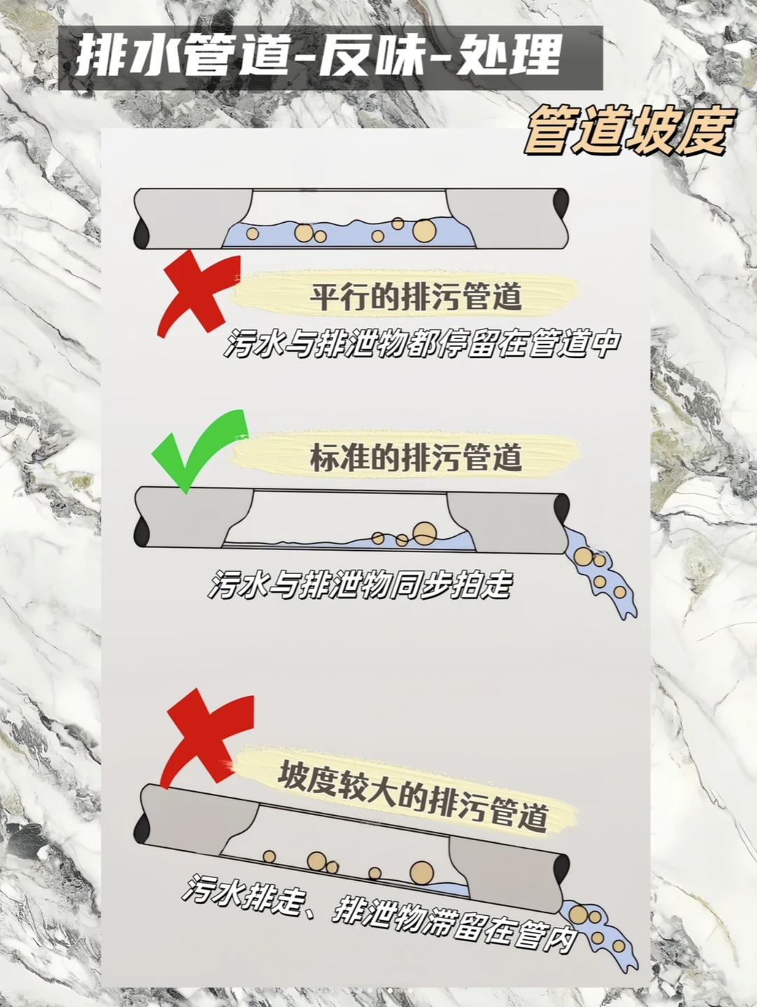 💡 避坑总结 - 三通选斜不选正 - 弯头用45°不用90° - 管径110做主排污,75/50做废水 - 管道必须有标准坡度 - 所有排水口都要有存水弯 装修是个细活,排水更是隐蔽工程,千万别图省事!把这些细节做好,才能拥有一个干爽无异味的卫生间~
