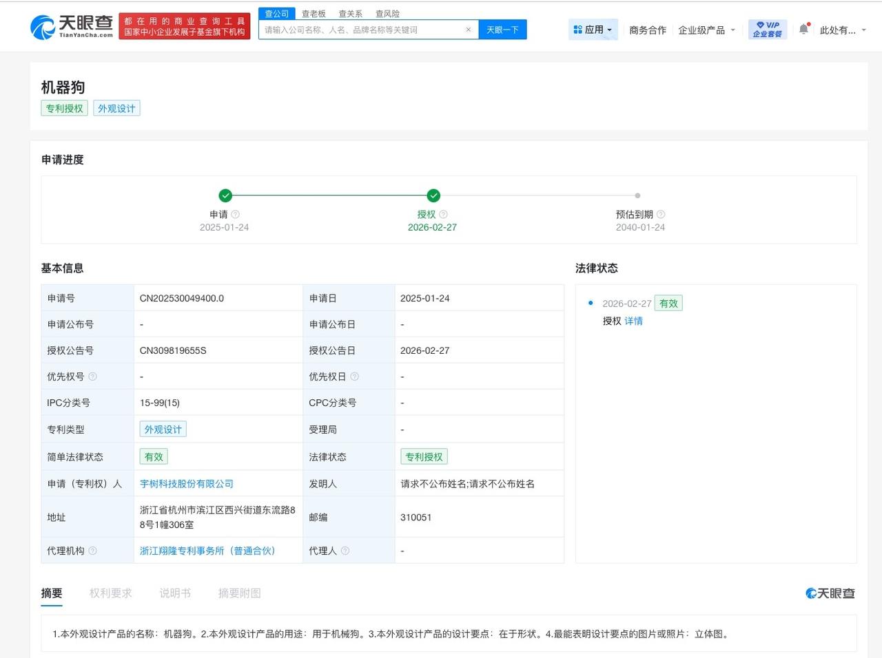 宇树科技机器狗外观专利获授权 天眼查知识产权信息显示,近日,宇树科技股份有限公司申请的“机器狗”外观专利获授权。摘要显示,本外观设计产品的用途为机械狗,本外观设计产品的设计要点在于形状。 宇树科技股份有限公司成立于2016年8月,法定代表人为王兴兴,注册资本约3.64亿人民币,经营范围含软件开发、软件销售、智能机器人的研发、智能机器人销售、工业机器人制造、工业机器人销售、机械设备研发等,由王兴兴、汉海信息技术(上海)有限公司、宁波红杉科盛股权投资合伙企业(有限合伙)等共同持股。 天眼查信息: