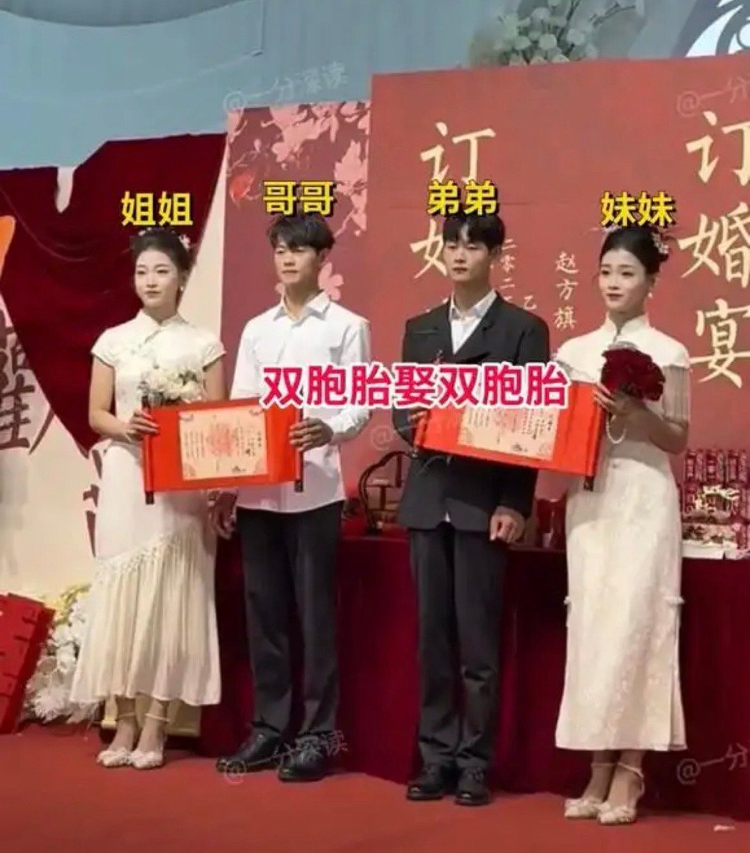 双胞胎兄弟娶双胞胎姐妹,上演双倍浪漫!这场‘最费眼’婚礼惊爆山东老话说得是,缘分之事乃天定。两人起始的时候是相遇 ,然后呢发展到相爱 ,这本身历经的可是千万分之一那般微小的概率。要是想去携手步入那婚姻的殿堂 ,那就更加需要两颗心是真诚且又坚定的。可是当下找对象的人太多,可供寻觅对象的机会稀缺少得很,有些寻觅对象之人太过挑剔,致使一段段缘分错失交臂,最后无可挽回地只能落得单身的局面。还有些人呢在寻觅对象之时碰到了令自己心仪的对象,毫不犹豫果断地答应步入婚姻殿堂,从而成就组建起一个家庭。假定两两人之间的爱情,属于幸运范畴。那么,当一对双胞胎一块儿爱上另一对双胞胎,这不就是两倍的浪漫以及幸运吗?哪曾想,山东惊现了一场,堪称史上“最费眼”的婚礼,原来是双胞胎兄弟,迎娶双胞胎姐妹。姐妹两方,长得简直一模一样,美得令人,傻傻地难以分清。网友们听闻后,瞬间炸了锅,纷纷说道:“万一认错了,可该咋办呢?”。这是一场有着别样特殊性的订婚仪式,无论哪个人瞧见了都会被惊得下巴掉落。有一个女孩站立在门口之处,其人身材呈现出高挑的特点,,身着白色的旗袍,头发盘起,整体展现出大气且优雅的姿态,模样相当漂亮。怎会料到,镜头忽地一转,右边居然站着一个模样长得完全相同的女孩。原来呀,这两个人乃是双胞胎,在同一天举行了订婚仪式,为了能够区分彼此,特意穿上了稍微有那么一点儿不一样的旗袍。即便衣服有了区分,然而两个人长相极为相像,对于外人而言,很难一下子就分辨出两人之间的差异。最为可怕的事情是,与这两个人一同订婚的,乃是一对双胞胎兄弟。是两个人,却好似从同一个模子刻画出来的,只是好在有着发型方面的差异,这才能够瞧出略有不一样的地方。并且其中一个身着白衬衣,另一个于外面套着黑西服,他俩俱都生得极为帅气。据说,有两对双胞胎,在相互认识之后,居然彼此瞧上了眼,都对对方心生欢喜。具体是姐姐喜欢上了哥哥,妹妹喜欢上了弟弟。如此这般,就算是嫁给兄弟二人,也不会出现辈分错乱的情况。这个两对双胞胎平常相处状况也十分融洽合谐,在恋爱之际 ,则会时刻相伴从不分离,不管是用餐之时 ,抑或是观摩电影之际 ,又或者是外出游玩之时 ,前往任何地方皆要彼此一同相伴,彼此之间的关系相当的和睦亲善。起始之时,缘由于长相方面的缘故,四个人常常会闹出笑话来,哥哥去约会呢,竟然错将妹妹当作姐姐,手都已然牵上了,一对上眼便傻眼了,弟弟相对比较粗枝大叶,更是时常认错姐妹俩,还亲错了人。随着交往时长增多,彼此性格得以知晓。哥哥性格沉稳,弟弟性格调皮,姐姐性格大度,妹妹性格直率。四人同时步入婚姻殿堂,直接省下一场酒席花费,还能收获两份礼金:着实堪称一件互利双赢之事!视频被曝光,网友们炸了锅,有人直接说道,平常看着那两张一模一样的脸,会不会出现出戏的情况呢,要是晚上光线不好看不清楚,把人认错了该怎么办呢?并且还有人带着打趣的口吻这样子说:“双胞胎去娶双胞胎,那么是不是还会要生出双胞胎来呀,他们所生的孩子会不会长得是一个模样呢?”。不过,却存在一些人持有这种观点,那就是双胞胎与双胞胎彼此结为婚姻,姐妹由此成为妯娌,如此情形一下子就使得亲戚数量减少了两家,更关键的是关系变得极为繁杂混乱,他们会这样问:“要是生育了子女,究竟该把对方称作叔叔大伯,还是姨夫姨妈?”。实际上,在结婚这件事上去寻觅伴侣,最为难得的便是缘分。四个人一块儿步入婚姻殿堂,拥有两倍的容貌值,两倍的甜蜜美满:这又为何不行呢?一分深读:“爱情的最高境界,是在相似的灵魂中,看见独一无二的你。”谈恋爱进而步入婚姻殿堂,这不但得仰仗缘分,还得全心全意去经营。就算是有着相似模样的两具躯壳,依旧会绽放出不尽相同的爱情花朵。恰恰是因为察觉到彼此不一样的内在,才会钟情于各异的人。对于双胞胎姐妹来讲,婚后虽离开家但人不分开,姐妹仍旧在一块儿。两个人面对一个长者,婆婆也会把握好尺度。婆媳之间的矛盾减少了,小家庭的关系也会十分融洽。对那一对双胞胎兄弟来讲,迎娶双胞胎姐妹,交流起来会更便利,相互之间会更知晓。由于明白那种被弄混的感觉,反倒会更看重内心的感受,爱情也会趋于愈发专注。固然,心理学家讲过,要是双胞胎夫妻过度依靠“双胞胎同盟”,那么极有可能削减夫妻两个人的私密空间。唯有维持分寸感,才可不可以让4人关系弄坏了2个小家庭。总之,真心去爱人的时候,爱的是那个人的灵魂,这已然是超越了外貌所具有的相似性方面的范畴。这般对于内在部分的追求,才是能够让婚姻收获幸福的关键所在秘诀。只有当眼中看重的先是她的内心,才会出现灵魂之间的共振现象,如此情形下又怎么会出现认错人的情况?