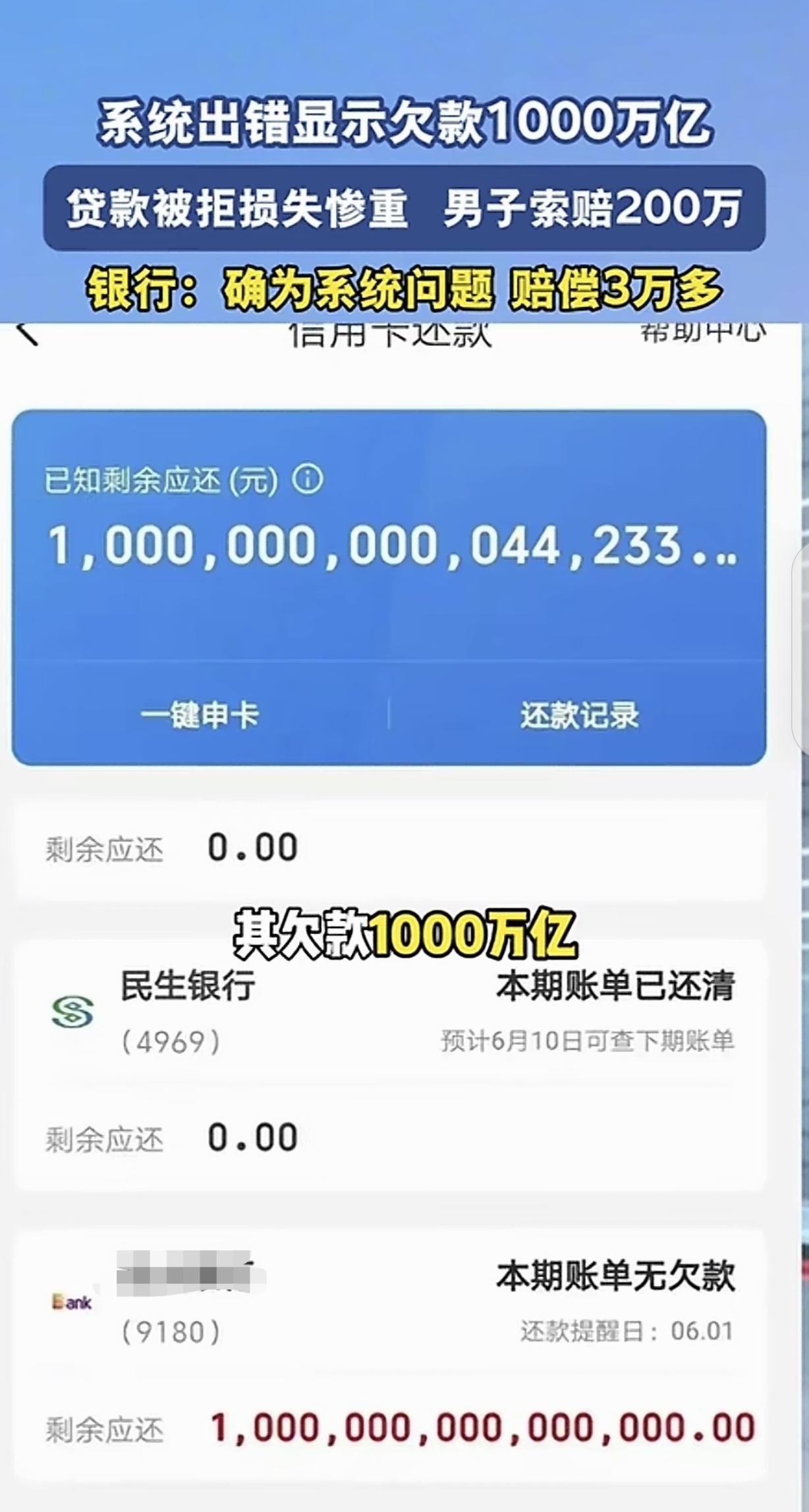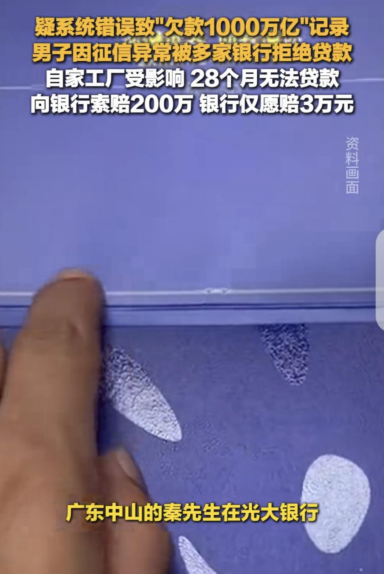 “憋住,别笑!”广东中山,一男子在银行办了10万的准贷记卡,没有逾过期,APP却显示他欠款1000万亿,可把男子吓得不轻,他赶紧找银行,原来是系统出错,可磨叽1年多才给他消除,这期间,他因为信用有污点,贷款被拒,只能忍痛贱卖了700万左右的货,损失惨重,男子一怒之下,跟银行索赔200万,银行承认有错,但只赔3万多,男子怒了,这是打发叫花子吗?网友:负可敌国了!这是从天地银行贷的款吧? 事情发生在一个下午,广东中山的制衣厂老板覃先生,像往常一样打开云闪付,准备看看自己的账户情况,毕竟厂里还有近百号工人要养,资金周转得时刻盯着,可他点开账户的那一刻,整个人都僵住了,屏幕上跳出来的欠款数字,让他以为自己眼花了,反复揉了揉眼睛,一个零一个零地数,没错,整整十五个零,欠款1000万亿,多一个零不多,少一个零不少。 可能很多人没概念,这1000万亿是什么概念?就算拿当年中国全年的GDP来比,GDP都得往后靠靠,把世界首富马斯克的全部身家都掏出来,也勉强够塞个牙缝,可谁能想到制造这场天大荒唐的,竟然只是一张额度只有10万的信用卡,而且覃先生从来没有逾期过。 回溯到2015年覃先生的制衣厂正处于上升期,厂里近百号工人踩着缝纫机没日没夜地赶货,生意做得有声有色,为了资金周转方便,他在光大银行办了一张“乐惠金准贷记卡”额度10万,从那以后的整整七年,他从来没有拖欠过年费,也没有赖过一分钱透支,银行系统里明明白白地记着,他是实打实的优质客户,把信用当成自己的命根子。 可就是这么一个重视信用的人,却被自己的开户行,一夜之间打成了“全球最大负翁”,覃先生当天就急疯了,立马冲进银行网点讨说法,银行柜员调出后台数据一看,脸色比他还难看,折腾了大半天,才给出结论,是银行系统数据同步出了严重错误。 工作人员拍着胸脯保证,会马上上报领导,尽快把错误修正,让他回家耐心等待,覃先生想着银行这么大的机构,肯定不会言而无信,就安心回了家老老实实地等着消息,可他万万没想到,这一等,就等了整整十四个月。 银行的处理可以拖延,可覃先生的日子不能跟着暂停,后台的错误数据没改,央行征信系统就自动把他钉在了“逾期”的耻辱柱上,留下了严重的信用污点,2022年底正是服装行业的旺季,覃先生急着申请125万的经营贷,用来备货、给工人发工资,可他把申请表递出去后,各家金融机构一翻开他的征信报告,就给出了六个字,信用极其恶劣申请表直接被甩回来,连商量的余地都没有。 没有贷款厂里的资金就断了链,齿轮一个接一个卡死,面料买不了,工人工资发不出,手里的订单也全线停摆,车间里堆着七百多万的成衣和面料,本来都是能换成真金白银的硬通货,可因为没钱周转,全成了烫手山芋,房东催租的电话响个不停,工人排着队来讨薪,覃先生兜里比脸还干净,走投无路之下,只能选择贱卖货物。 更让人窝火的是,后来大家才知道,早在2021年央行当地支行就给光大银行发过函,白纸黑字要求规范这类卡片的标记方式,银行收到了、看到了,却压根没当回事,把函件搁在一边吃灰,直到一年后系统出问题,所有的代价,全压在了毫不知情的覃先生身上。 错误消除之后,覃先生坐下来算了一笔账,货物折价的损失、资金拆借的利息、工人的误工费用,零零总总加起来,损失惨重,于是他向光大银行提出了两百万元的索赔,希望能弥补自己的损失。 可银行的回应,堪称教科书级别的“高姿态低诚意”:他们承认自己有错,也承认处理拖延,可给出的赔偿方案,却只有三万多块,还是按所谓的利息损失来算的。覃先生在调解现场气得手都在抖,心里满是委屈和愤怒,这三万块,连他贱卖七百多万货物的一个零头都够不上,更别提这十四个月里,他熬出来的白发和无数个失眠的夜晚,这简直就是打发叫花子! 这事被捅到网上后,评论区瞬间变成了大型吐槽现场,网友们的段子满天飞,“负可敌国”“从天地银行贷的款吧”,笑声震天响。可笑完之后,更多人陷入了沉默,大家都明白,这背后藏着普通人的无奈。 想想看我们普通人要是逾期一天,银行的催收电话能手机打爆,征信黑名单能跟自己一辈子,影响买房、贷款、甚至找工作,可银行自己搞出这么大的篓子,生生毁掉一个人苦心经营了多年的事业,转头就只掏三万块打发人,这也太不公平了。 一个濒临破产的工厂,一个四处奔波、满脸疲惫的中年人,一场两百万元对三万多元的拉锯战,其实这场官司争的早就不是钱了,而是一个做了二十年生意、从没赖过一分钱、把信用当命的人,面对银行这样的庞然大物时,想要守住的最后一点尊严,一点公道。