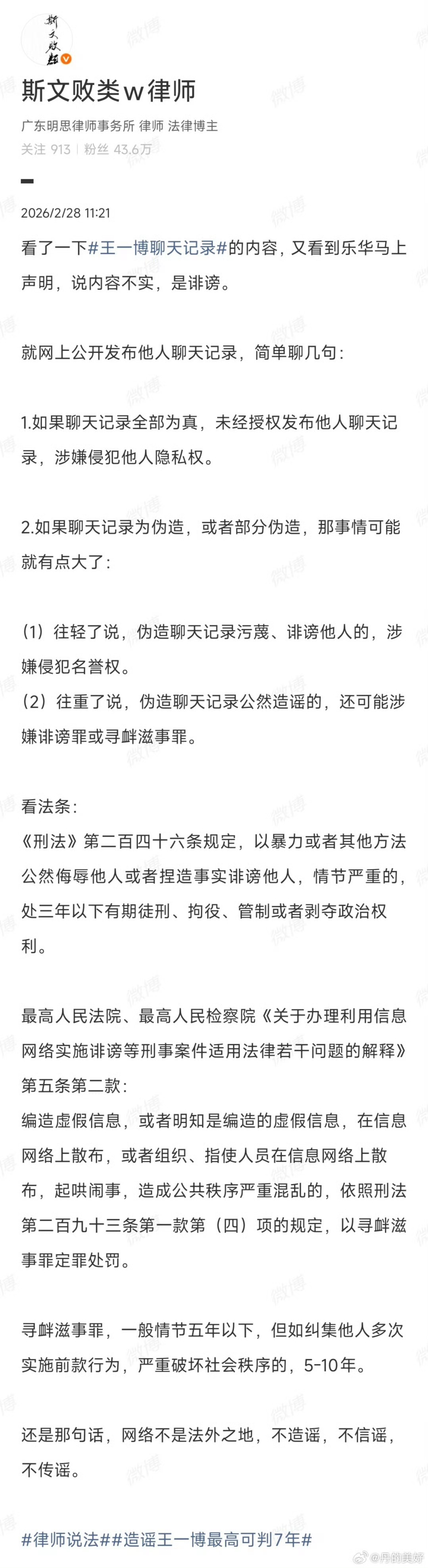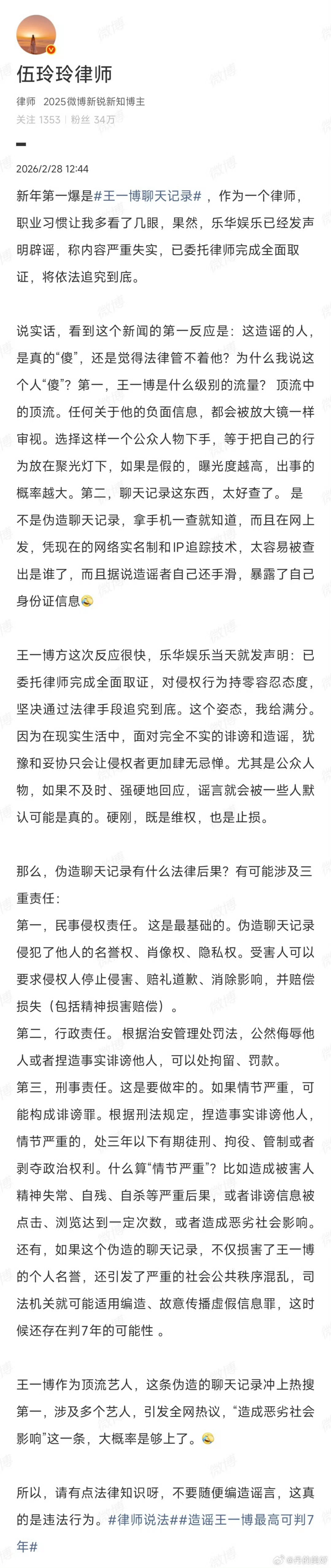疑似王一博爆料人朋友圈 毫无疑问,此次设计构陷事件也会成为数字事件之后,互联网又一典型案例。毕竟一月新规刚落地就撞上枪口,挂梯子翻墙造谣+跨境传播+回流发酵,情节恶劣程度直接拉满。现在全网蹲一个结果:所有人都在关注,到底怎么判?王一博