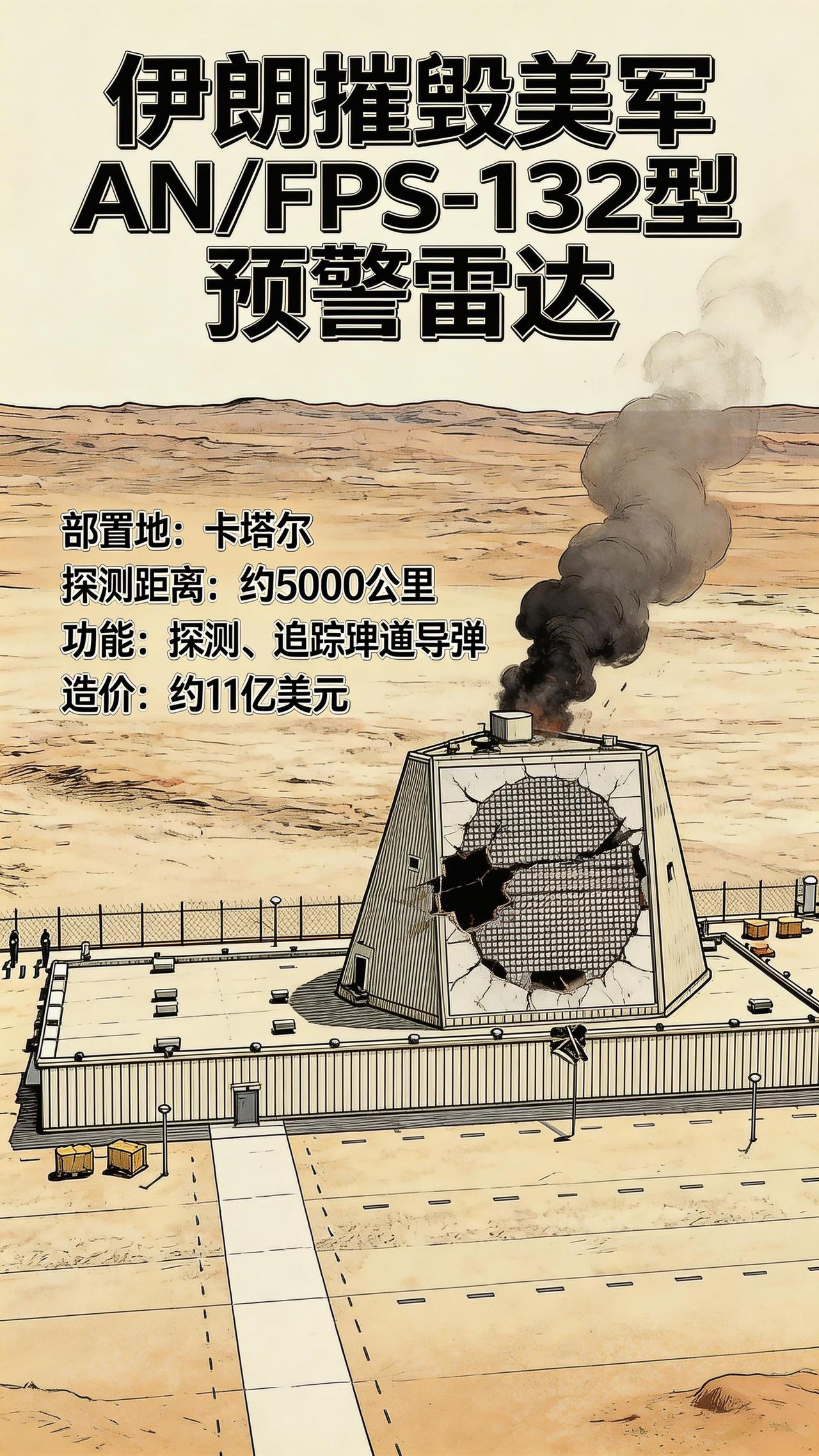 波斯猫要发威了吗? 伊朗伊斯兰革命卫队公共关系部宣布:一套位于卡塔尔的美军AN/FPS-132型预警雷达系统已被彻底摧毁。 这款大名鼎鼎的雷达也被称为“铺路爪”(Pave Paws),探测距离约5000公里,采用固态相控阵技术,主要用于探测和追踪弹道导弹发射,建造成本约11亿美元。 实际上,这款雷达距离伊朗本土最近点只有约190-250公里,这个距离完全在伊朗导弹的射程之内,但是美国就是笃定了伊朗不敢打。