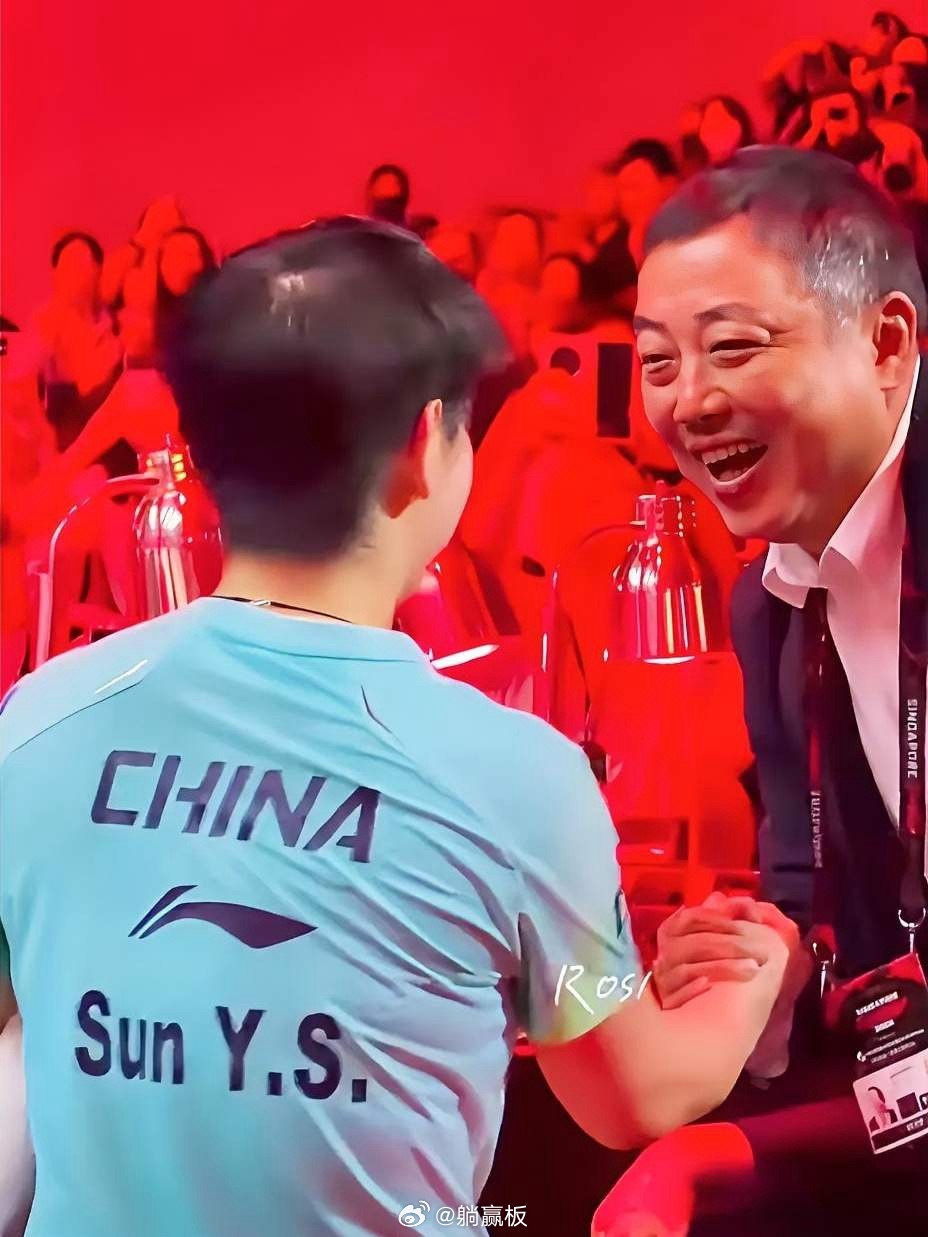 莎莎战胜早田挺进四强,赛后马琳带她见了刘国梁,刘国梁见到莎莎合不拢嘴!也对,刘国梁是国际乒联副主席,新加坡大满贯打到四强,他这时候出现很合时宜,重点是欣赏了莎莎比赛,这对刘国梁来讲最开心!莎莎参加东京奥运会,就是刘国梁力排众议,当然莎莎没让他失望!巴奥时期莎莎肩负重任,跟楚钦一起争混双金牌,两小只不辱使命,国乒东京淋的雨,他们在巴黎给晒干了!好巧不巧,莎莎今天又是“抗日英雄”!所以,无论何时何地,在刘国梁这里,莎莎和楚钦都是国乒英雄!